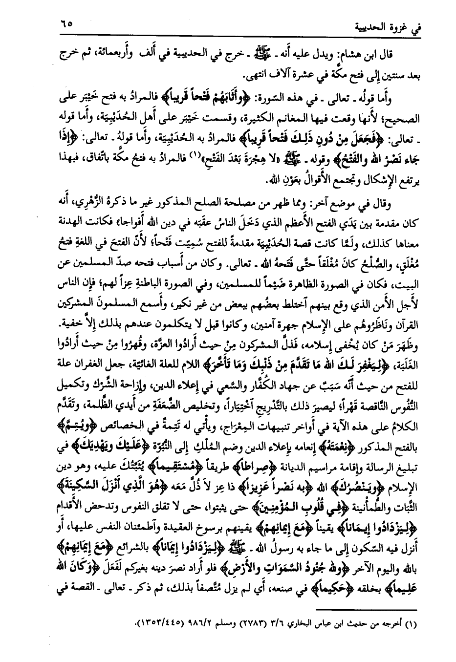 وقال في موضع آخر: ومما ظهر من مصلحة الصلح المذكور غير ما ذكره الزّهري، أنه كان مقدمة بين يدي الفتح الأعظم الذي دخل الناس عقبه في دين الله أفواجا» فكانت الهدنة معناها كذلك، ولمّا كانت قصة الحديبية مقدمة للفتح سميّت فتحا، لأنّ الفتح في اللغة فتح مغلق، والصّلح كان مغلقا حتّى فتحه الله- تعالى. وكان من أسباب فتحه صدّ المسلمين عن البيت، فكان في الصورة الظاهرة ضيماً للمسلمين، وفي الصورة الباطنة عزاً لهم، فإن الناس لأجل الأمن الذي وقع بينهم اختلط بعضهم ببعض من غير نكير، وأسمع المسلمون المشركين القرآن وناظروهم على الإسلام جهرة آمنين، وكانوا قبل لا يتكلمون عندهم بذلك إلّا خفية.