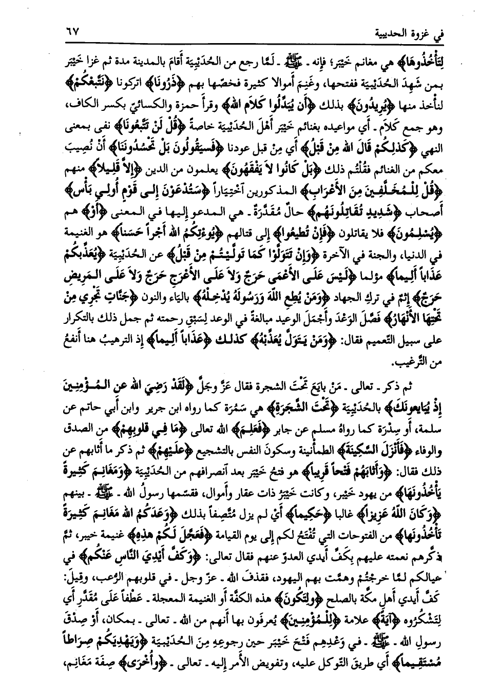 ثم ذكر- تعالى- من بايع تحت الشجرة فقال عز وجل لَقَدْ رَضِيَ اللَّهُ عَنِ الْمُؤْمِنِينَ إِذْ يُبايِعُونَكَ بالحديبية تَحْتَ الشَّجَرَةِ هي سمرة كما رواه ابن جرير وابن أبي حاتم عن سلمة، أو سدرة كما رواه مسلم عن جابر فَعَلِمَ اللَّه تعالى ما فِي قُلُوبِهِمْ من الصدق والوفاء فَأَنْزَلَ السَّكِينَةَ الطمأنينة وسكون النفس بالتشجيع عَلَيْهِمْ ثم ذكر ما أثابهم عن ذلك فقال: وَأَثابَهُمْ فَتْحاً قَرِيباً هو فتح خيبر بعد انصرافهم من الحديبية وَمَغانِمَ كَثِيرَةً يَأْخُذُونَها من يهود خيبر، وكانت خيبر ذات عقار وأموال، فقسّمها رسول الله- صلى الله عليه وسلم- بينهم وَكانَ اللَّهُ عَزِيزاً غالبا حَكِيماً أي لم يزل متّصفا بذلك وَعَدَكُمُ اللَّهُ مَغانِمَ كَثِيرَةً تَأْخُذُونَها من الفتوحات التي تفتح لكم إلى يوم القيامة فَعَجَّلَ لَكُمْ هذِهِ غنيمة خيبر، ثمّ ذكّرهم نعمته عليهم بكفّ أيدي العدوّ عنهم فقال تعالى: وَكَفَّ أَيْدِيَ النَّاسِ عَنْكُمْ في عيالكم لمّا خرجتم وهمّت بهم اليهود، فقذف الله- عز وجل- في قلوبهم الرّعب، وقيل: