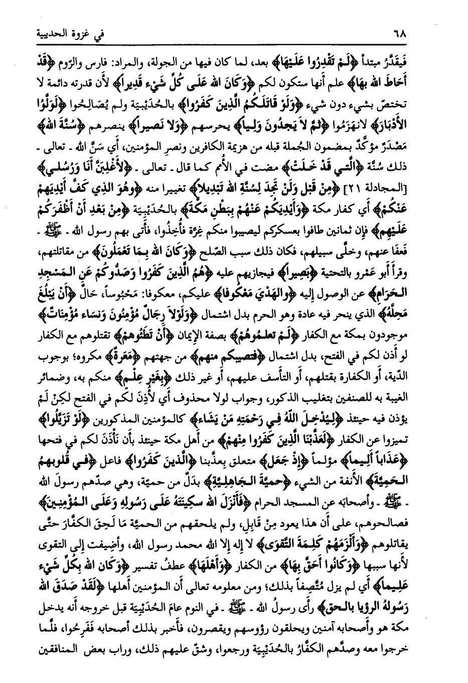 فيقدّر مبتدأ لَمْ تَقْدِرُوا عَلَيْها بعد، لما كان فيها من الجولة، والمراد: فارس والرّوم قَدْ أَحاطَ اللَّهُ بِها علم إنها ستكون لكم وَكانَ اللَّهُ عَلى كُلِّ شَيْءٍ قَدِيراً لأن قدرته دائمة لا تختصّ بشيء دون شيء وَلَوْ قاتَلَكُمُ الَّذِينَ كَفَرُوا بالحديبية ولم يصالحوا لَوَلَّوُا الْأَدْبارَ لانهزموا ثُمَّ لا يَجِدُونَ وَلِيًّا يحرسهم وَلا نَصِيراً ينصرهم سُنَّةَ اللَّهِ مصدر مؤكَّد بمضمون الجملة قبله من هزيمة الكافرين ونصر المؤمنين، أي سنّ الله- تعالى- ذلك سنّة الَّتِي قَدْ خَلَتْ مضت في الأمم كما قال- تعالى- لَأَغْلِبَنَّ أَنَا وَرُسُلِي [المجادلة 21] مِنْ قَبْلُ وَلَنْ تَجِدَ لِسُنَّةِ اللَّهِ تَبْدِيلًا تغييرا منه وَهُوَ الَّذِي كَفَّ أَيْدِيَهُمْ عَنْكُمْ أي كفار مكة وَأَيْدِيَكُمْ عَنْهُمْ بِبَطْنِ مَكَّةَ بالحديبية مِنْ بَعْدِ أَنْ أَظْفَرَكُمْ عَلَيْهِمْ فإن ثمانين طافوا بعسكركم ليصيبوا منكم غرّة فأخذوا، فأتى بهم رسول الله- صلى الله عليه وسلم- فعفا عنهم، وخلّى سبيلهم، فكان ذلك سبب الصّلح وَكانَ اللَّهُ بِما تَعْمَلُونَ من مقاتلتهم، وقرأ أبو عمرو بالتحتية بَصِيراً فيجازيهم عليه هُمُ الَّذِينَ كَفَرُوا وَصَدُّوكُمْ عَنِ الْمَسْجِدِ الْحَرامِ عن الوصول إليه وَالْهَدْيَ مَعْكُوفاً عليكم، معكوفا: محبوسا، حال أَنْ يَبْلُغَ مَحِلَّهُ الذي ينحر فيه عادة وهو الحرم بدل اشتمال وَلَوْلا رِجالٌ مُؤْمِنُونَ وَنِساءٌ مُؤْمِناتٌ موجودون بمكة مع الكفار لَمْ تَعْلَمُوهُمْ بصفة الإيمان أَنْ تَطَؤُهُمْ تقتلوهم مع الكفار لو أذن لكم في الفتح، بدل اشتمال فَتُصِيبَكُمْ مِنْهُمْ من جهتهم مَعَرَّةٌ مكروه، بوجوب الدّية، أو الكفارة بقتلهم، أو التأسف عليهم، أو غير ذلك بِغَيْرِ عِلْمٍ منكم به، وضمائر الغيبة به للصنفين بتغليب الذكور، وجواب لولا محذوف أي لأذن لكم في الفتح لكن لم يؤذن فيه حينئذ لِيُدْخِلَ اللَّهُ فِي رَحْمَتِهِ مَنْ يَشاءُ كالمؤمنين المذكورين لَوْ تَزَيَّلُوا تميزوا عن الكفار لَعَذَّبْنَا الَّذِينَ كَفَرُوا مِنْهُمْ من أهل مكة حينئذ بأن نأذن لكم في فتحها عَذاباً أَلِيماً مؤلماً إِذْ جَعَلَ متعلق بِعذَّبنا الَّذِينَ كَفَرُوا فاعل فِي قُلُوبِهِمُ الْحَمِيَّةَ الأنفة من الشيء حَمِيَّةَ الْجاهِلِيَّةِ بدل من حميّة، وهي صدّهم رسول الله- صلى الله عليه وسلم- وأصحابه عن المسجد الحرام فَأَنْزَلَ اللَّهُ سَكِينَتَهُ عَلى رَسُولِهِ وَعَلَى الْمُؤْمِنِينَ فصالحوهم، على أن هذا يعود من قابل، ولم يلحقهم من الحميّة ما لحق الكفّار حتّى يقاتلوهم وَأَلْزَمَهُمْ كَلِمَةَ التَّقْوى لا إله إلا الله محمد رسول الله، وأضيفت إلى التقوى لأنها سببها وَكانُوا أَحَقَّ بِها من الكفار وَأَهْلَها عطف تفسير وَكانَ اللَّهُ بِكُلِّ شَيْءٍ عَلِيماً أي لم يزل متّصفا بذلك، ومن معلومه تعالى أن المؤمنين أهلها لَقَدْ صَدَقَ اللَّهُ رَسُولَهُ الرُّؤْيا بِالْحَقِّ رأى رسول الله- صلى الله عليه وسلم- في النوم عام الحديبية قبل خروجه أنه يدخل مكة هو وأصحابه آمنين ويحلقون رؤوسهم ويقصرون، فأخبر بذلك أصحابه ففرحوا، فلّما خرجوا معه وصدّهم الكفّار بالحديبية ورجعوا، وشقّ عليهم ذلك، وراب بعض المنافقين