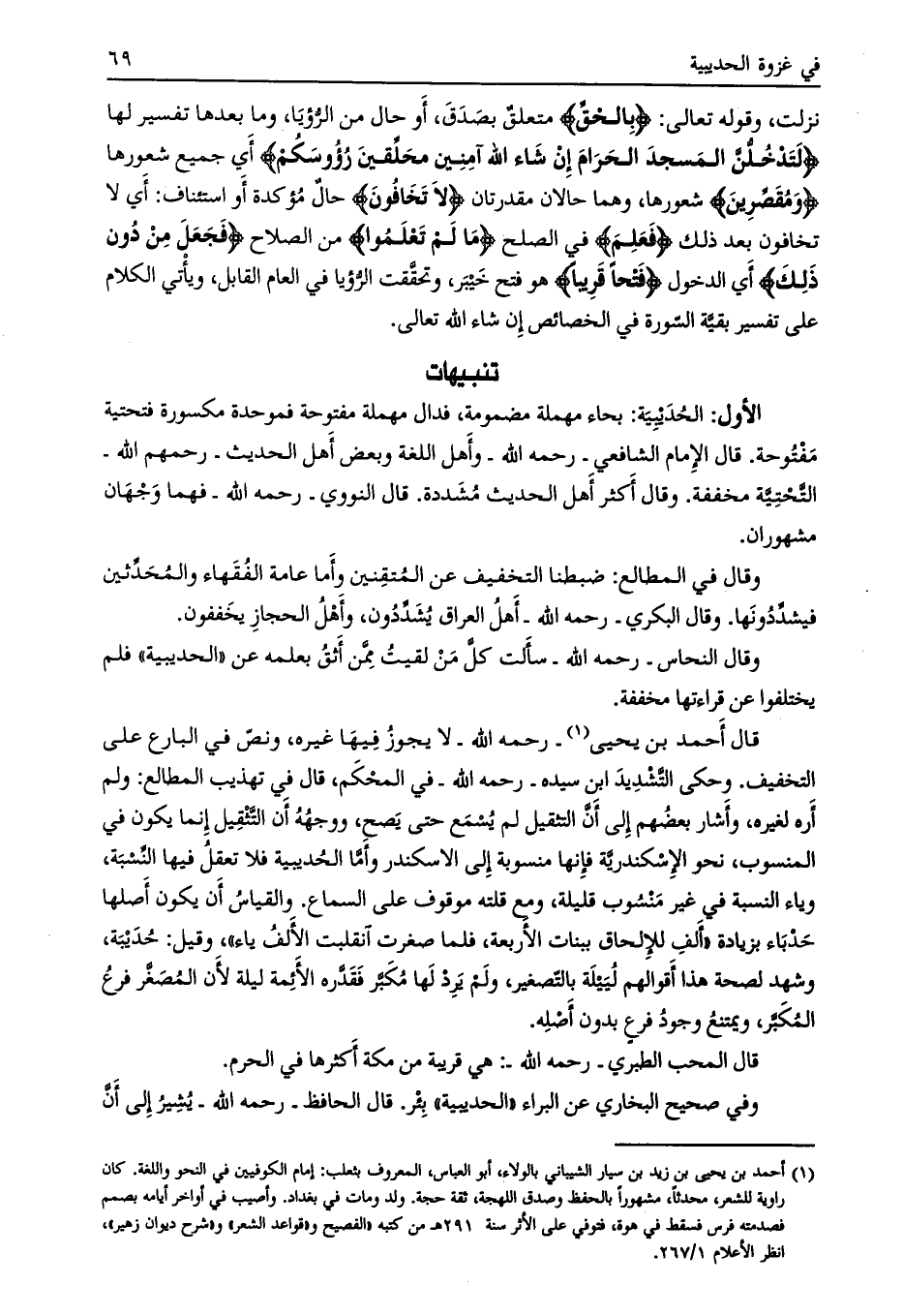 قال أحمد بن يحيى [ (1) ]- رحمه الله- لا يجوز فيها غيره، ونصّ في البارع على التخفيف. وحكى التّشديد ابن سيده- رحمه الله- في المحكم، قال في تهذيب المطالع: ولم أره لغيره، وأشار بعضهم إلى أنّ التثقيل لم يسمع حتى يصح، ووجهه أن التّثقيل إنما يكون في المنسوب، نحو الإسكندريّة فإنها منسوبة إلى الإسكندر وأمّا الحديبية فلا تعقل فيها النّسبة، وياء النسبة في غير منسوب قليلة، ومع قلته موقوف على السماع. والقياس أن يكون أصلها حدباء بزيادة «ألف للإلحاق ببنات الأربعة، فلما صغرت انقلبت الألف ياء» ، وقيل: حديبة، وشهد لصحة هذا أقوالهم لييلة بالتّصغير، ولم يرد لها مكبّر فقدّره الأئمة ليلة لأن المصغّر فرع المكبّر، ويمتنع وجود فرع بدون أصله.