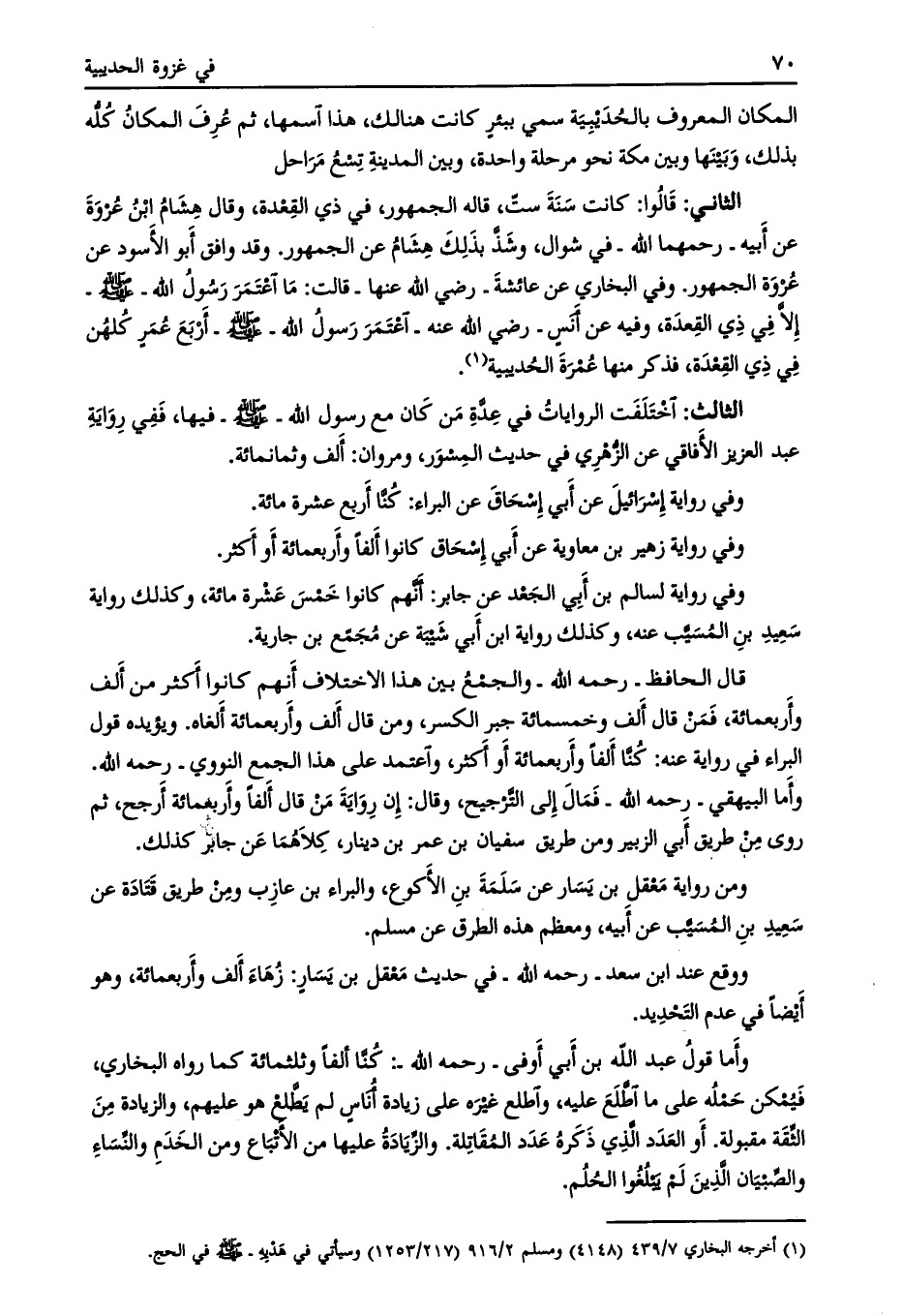 وأما قول عبد الله بن أبي أوفى- رحمه الله-: كنّا ألفا وثلاثمائة كما رواه البخاري، فيمكن حمله على ما أطلع عليه، واطلع غيره على زيادة أناس لم يطّلع هو عليهم، والزيادة من الثّقة مقبولة. أو العدد الّذى ذكره عدد المقاتلة. والزّيادة عليها من الأتباع ومن الخدم والنّساء والصّبيان الّذين لم يبلغوا الحلم.