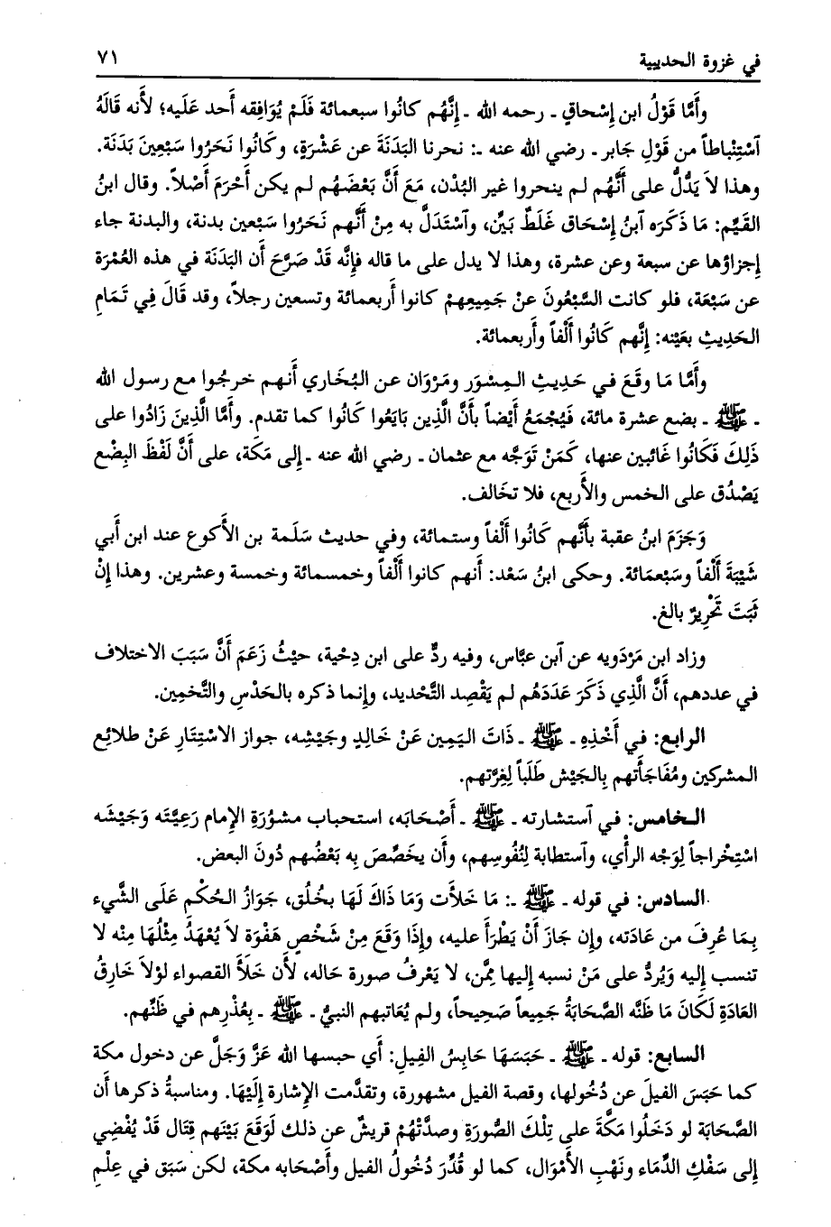 وهذا لا يدل على أنّهم لم ينحروا غير البدن، مع أنّ بعضهم لم يكن أحرم أصلا. وقال ابن القيم: ما ذكره ابن إسحاق غلط بيّن، واستدلّ به من أنّهم نحروا سبعين بدنة، والبدنة جاء إجزاؤها عن سبعة وعن عشرة، وهذا لا يدل على ما قاله فإنّه قد صرّح أن البدنة في هذه العمرة عن سبعة، فلو كانت السّبعون عن جميعهم كانوا أربعمائة وتسعين رجلا، وقد قال في تمام الحديث بعينه: إنّهم كانوا ألفا وأربعمائة.