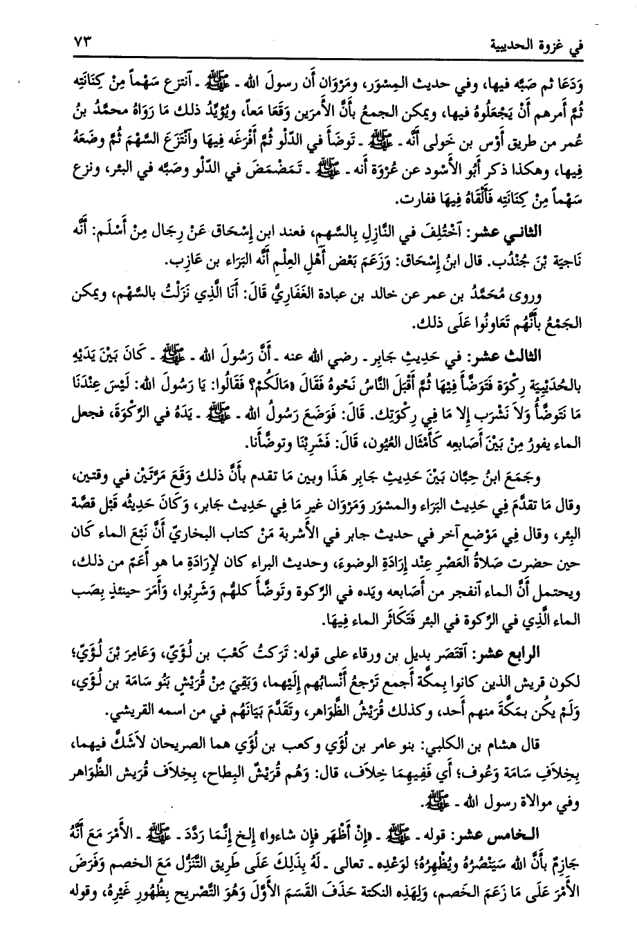 الثالث عشر: في حديث جابر- رضي الله عنه- أن رسول الله- صلى الله عليه وسلم- كان بين يديه بالحديبية ركوة فتوضّأ فيها ثمّ أقبل النّاس نحوه فقال «ما لكم؟ فقالوا: يا رسول الله: ليس عندنا ما نتوضّأ ولا نشرب إلا ما في ركوتك. قال: فوضع رسول الله- صلى الله عليه وسلّم- يده في الرّكوة، فجعل الماء يفور من بين أصابعه كأمثال العيون، قال: فشربنا وتوضّأنا.