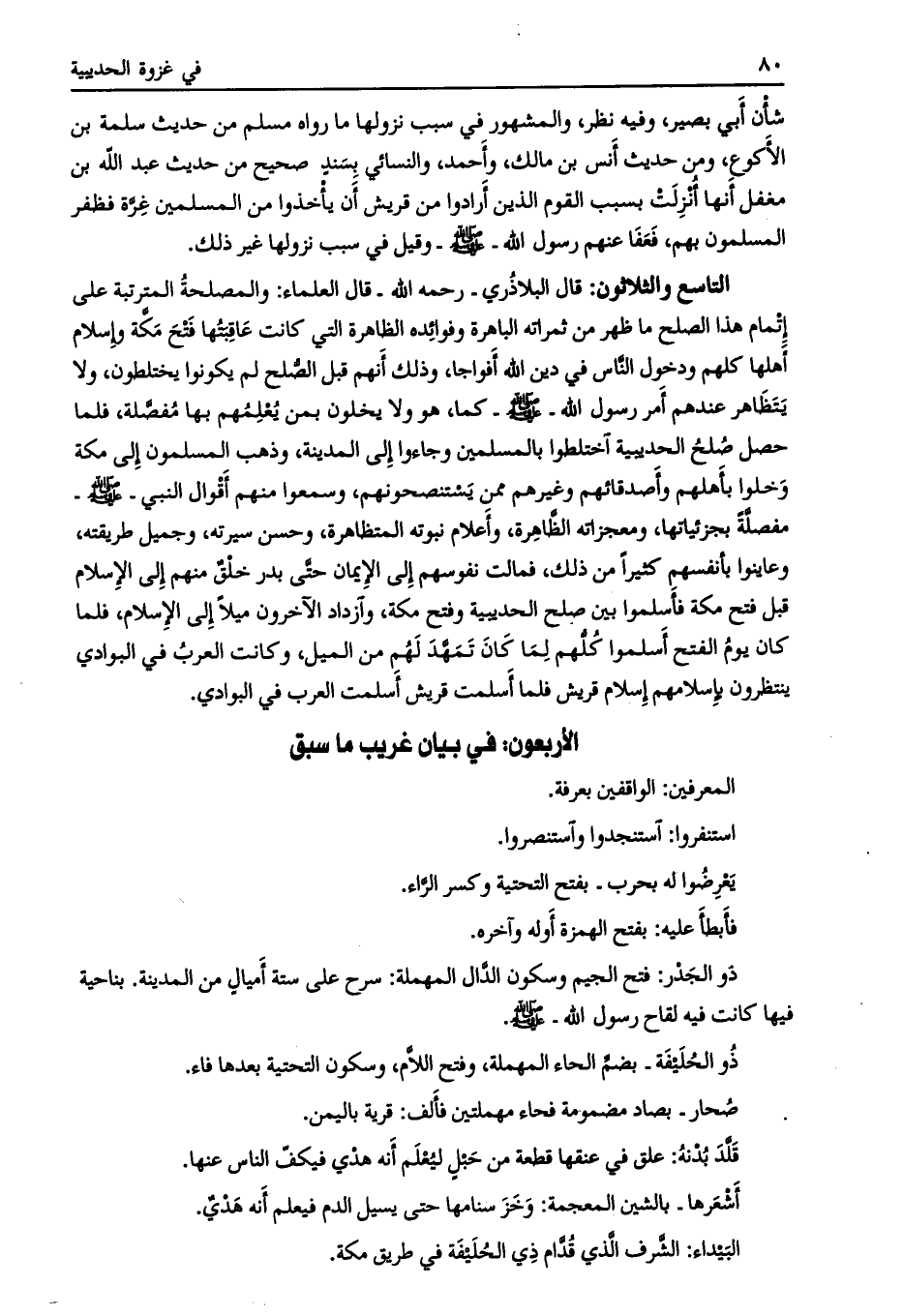 التاسع والثلاثون: قال البلاذري- رحمه الله- قال العلماء: والمصلحة المترتبة على إتمام هذا الصلح ما ظهر من ثمراته الباهرة وفوائده الظاهرة التي كانت عاقبتها فتح مكّة وإسلام أهلها كلهم ودخول النّاس في دين الله أفواجا، وذلك أنهم قبل الصّلح لم يكونوا يختلطون، ولا يتظاهر عندهم أمر رسول الله- صلى الله عليه وسلّم- كما، هو ولا يخلون بمن يعلمهم بها مفصّلة، فلما حصل صلح الحديبية اختلطوا بالمسلمين وجاءوا إلى المدينة، وذهب المسلمون إلى مكة وخلوا بأهلهم وأصدقائهم وغيرهم ممن يستنصحونهم، وسمعوا منهم أقوال النبي- صلى الله عليه وسلّم- مفصلّة بجزئياتها، ومعجزاته الظّاهرة، وأعلام نبوته المتظاهرة، وحسن سيرته، وجميل طريقته، وعاينوا بأنفسهم كثيرا من ذلك، فمالت نفوسهم إلى الإيمان حتّى بدر خلق منهم إلى الإسلام قبل فتح مكة فأسلموا بين صلح الحديبية وفتح مكة، وازداد الآخرون ميلا إلى الإسلام، فلما كان يوم الفتح أسلموا كلّهم لما كان تمهّد لهم من الميل، وكانت العرب في البوادي ينتظرون بإسلامهم إسلام قريش فلما أسلمت قريش أسلمت العرب في البوادي.