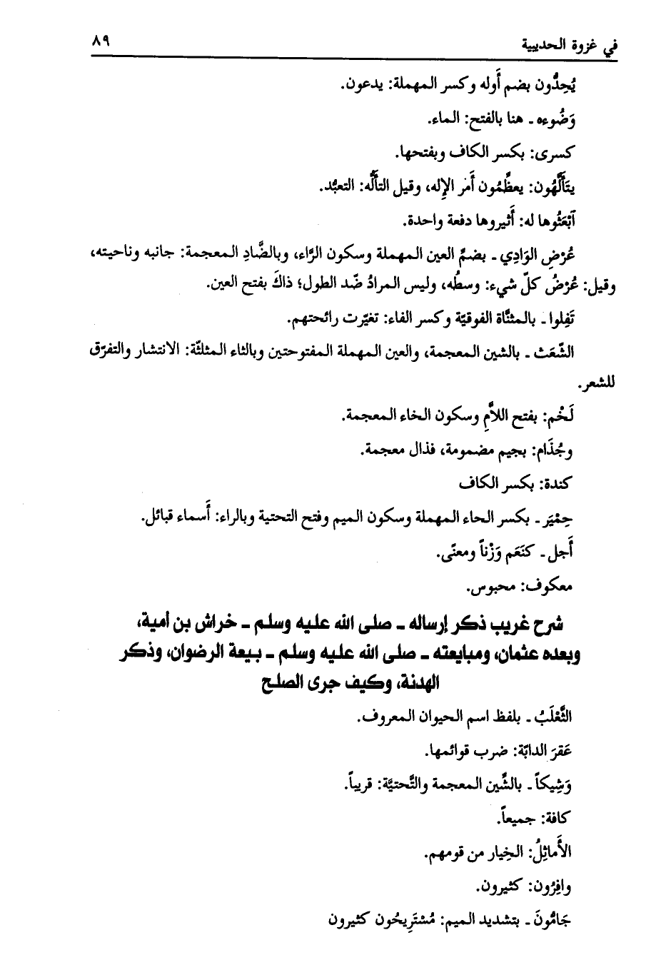 شرح غريب ذكر إرساله- صلى الله عليه وسلّم- خراش بن أمية، وبعده عثمان، ومبايعته- صلى الله عليه وسلّم- بيعة الرضوان، وذكر الهدنة، وكيف جرى الصلح
