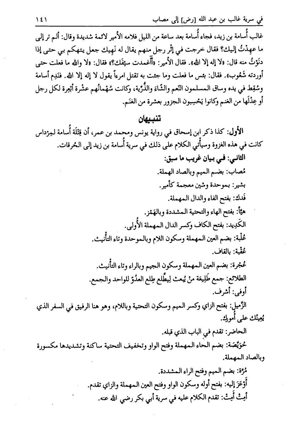 غالب أسامة بن زيد، فجاء أسامة بعد ساعة من الليل فلامه الأمير لائمة شديدة وقال: ألم تر إلى ما عهدت إليك؟ فقال خرجت في إثر رجل منهم يقال له نهيك جعل يتهكم بي حتى إذا دنوت منه قال: «لا إله إلا الله» . فقال الأمير: «أأغمدت سيفك» ؟ فقال: «لا والله ما فعلت حتى أوردته شعوب» . فقال: بئس ما فعلت وما جئت به تقتل امرءا يقول لا إله إلا الله. فندم أسامة وسقط في يده وساق المسلمون النّعم والشّاء والذّرية، وكانت سهمانهم عشرة أبعرة لكل رجل أو عدلها من الغنم وكانوا يحسبون الجزور بعشرة من الغنم.