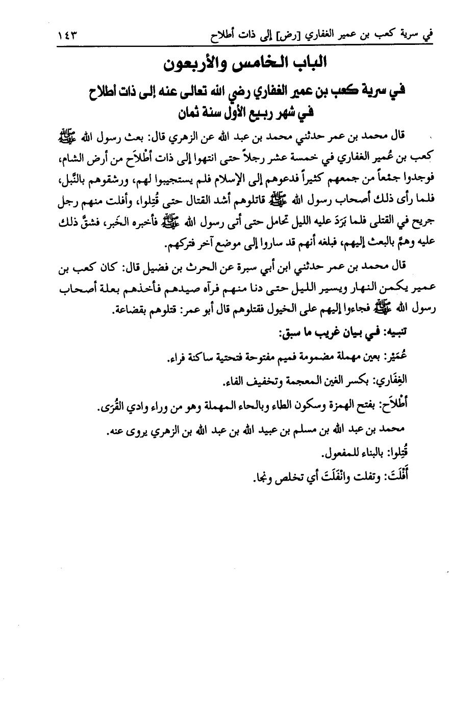 الباب الخامس والأربعون في سرية كعب بن عمير الغفاري رضي الله تعالى عنه إلى ذات أطلاح في شهر ربيع الأول سنة ثمان