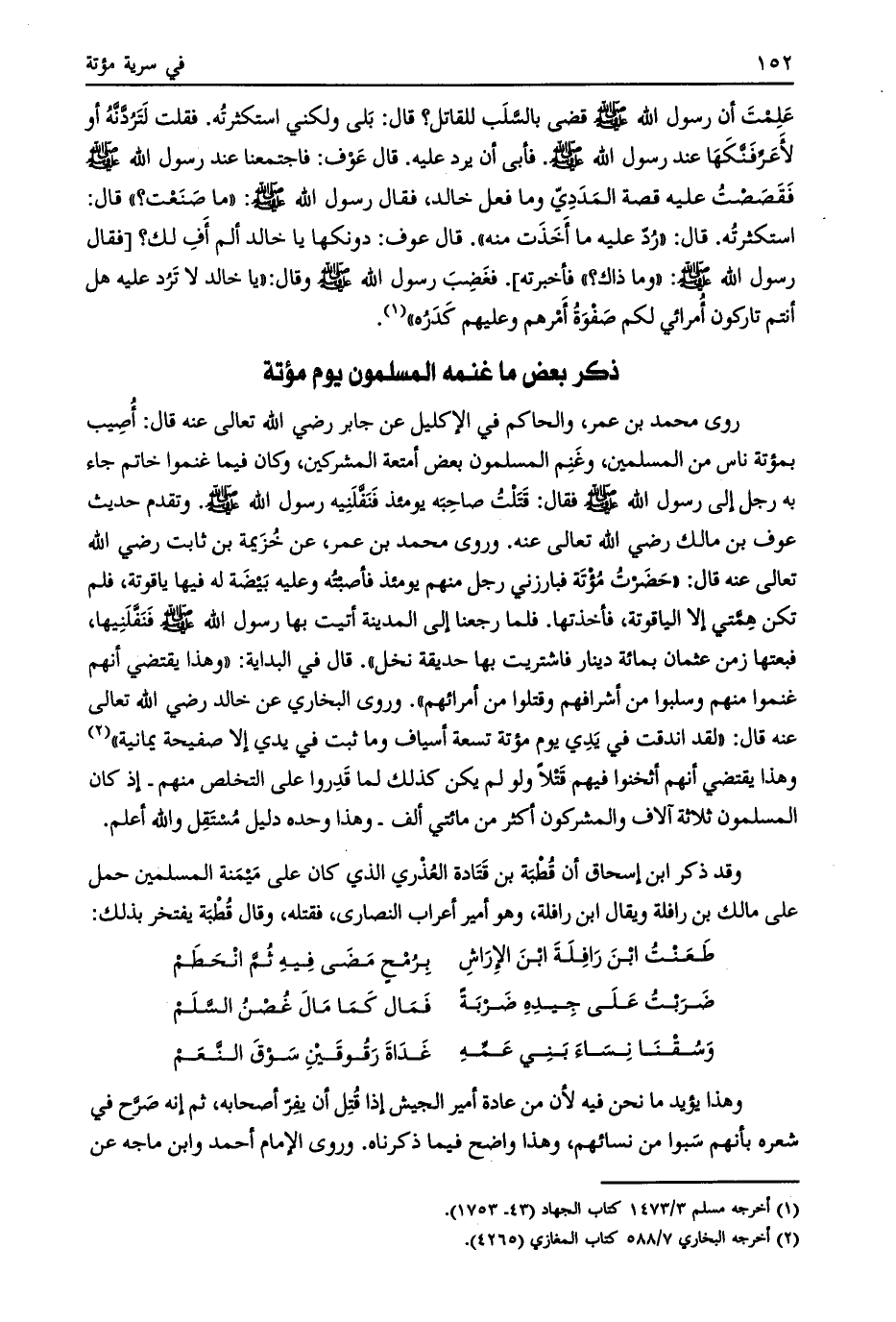 روى محمد بن عمر، والحاكم في الإكليل عن جابر رضي الله تعالى عنه قال: أصيب بمؤتة ناس من المسلمين، وغنم المسلمون بعض أمتعة المشركين، وكان فيما غنموا خاتم جاء به رجل إلى رسول الله صلى الله عليه وسلم فقال: قتلت صاحبه يومئذ فنفّلنيه رسول الله صلى الله عليه وسلم. وتقدم حديث عوف بن مالك رضي الله تعالى عنه. وروى محمد بن عمر، عن خزيمة بن ثابت رضي الله تعالى عنه قال: «حضرت مؤتة فبارزني رجل منهم يومئذ فأصبته وعليه بيضة له فيها ياقوتة، فلم تكن همّتي إلا الياقوتة، فأخذتها. فلما رجعنا إلى المدينة أتيت بها رسول الله صلى الله عليه وسلم فنفّلنيها، فبعتها زمن عثمان بمائة دينار فاشتريت بها حديقة نخل» . قال في البداية: «وهذا يقتضي أنهم غنموا منهم وسلبوا من أشرافهم وقتلوا من أمرائهم» . وروى البخاري عن خالد رضي الله تعالى عنه قال: «لقد اندقت في يدي يوم مؤتة تسعة أسياف وما ثبت في يدي إلا صفيحة يمانية» [ (2) ] وهذا يقتضي أنهم أثخنوا فيهم قتلا ولو لم يكن كذلك لما قدروا على التخلص منهم- إذ كان المسلمون ثلاثة آلاف والمشركون أكثر من مائتي ألف- وهذا وحده دليل مستقل والله أعلم.
