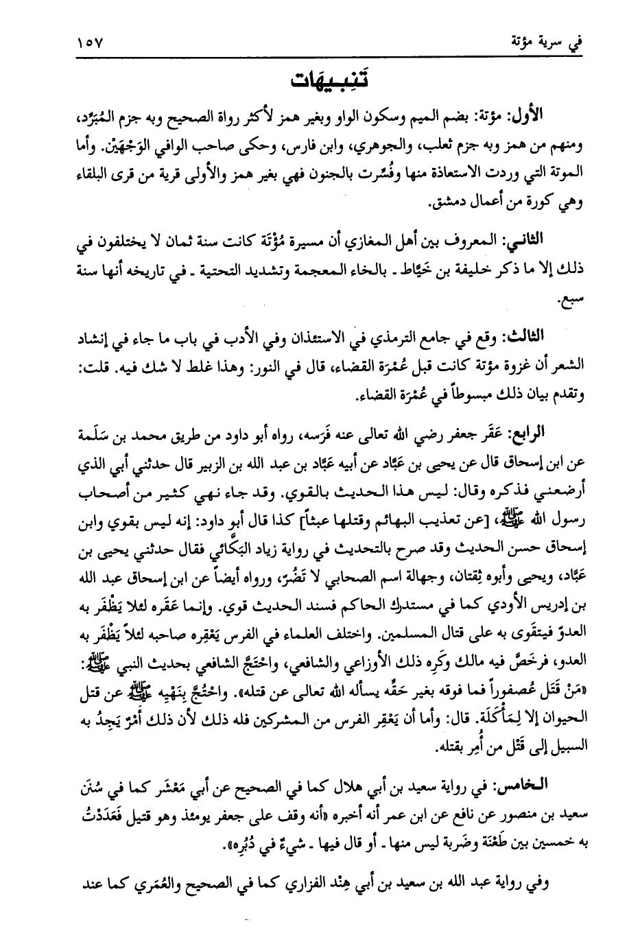 الرابع: عقر جعفر رضي اللَّه تعالى عنه فرسه، رواه أبو داود من طريق محمد بن سلمة عن ابن إسحاق قال عن يحيى بن عبّاد عن أبيه عباد بن عبد اللَّه بن الزبير قال حدثني أبي الذي أرضعني فذكره وقال: ليس هذا الحديث بالقوي. وقد جاء نهي كثير من أصحاب رسول اللَّه صلى اللَّه عليه وسلم، [عن تعذيب البهائم وقتلها عبثا] كذا قال أبو داود: إنه ليس بقوي وابن إسحاق حسن الحديث وقد صرح بالتحديث في رواية زياد البكّائي فقال حدثني يحيى بن عبّاد، ويحيى وأبوه ثقتان، وجهالة اسم الصحابي لا تضرّ، ورواه أيضاً عن ابن إسحاق عبد اللَّه بن إدريس الأودي كما في مستدرك الحاكم فسند الحديث قوي. وإنما عقره لئلا يظفر به العدوّ فيتقوى به على قتال المسلمين. واختلف العلماء في الفرس يعقره صاحبه لئلا يظفر به العدو، فرخصّ فيه مالك وكره ذلك الأوزاعي والشافعي، واحتجّ الشافعي