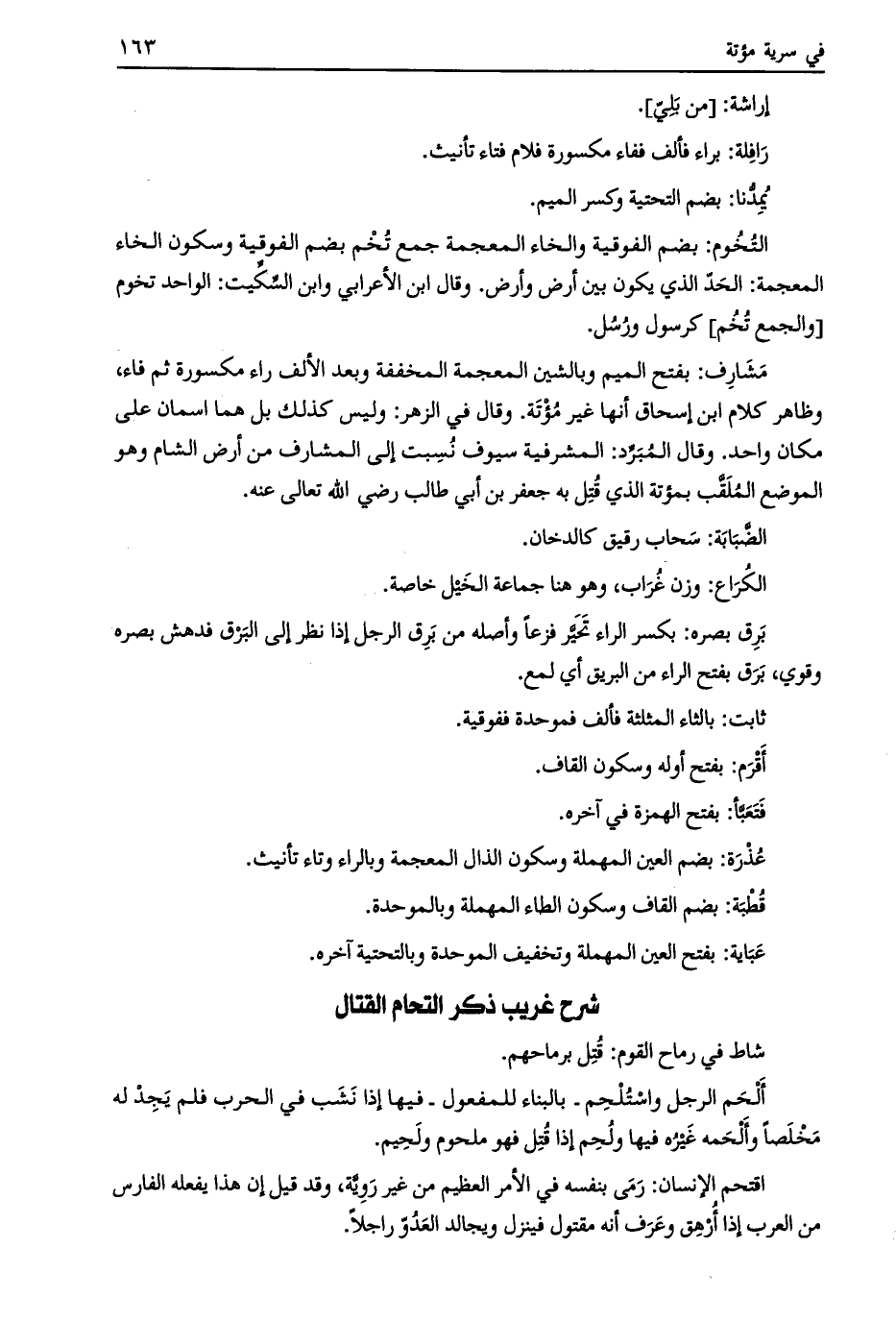 مشارف: بفتح الميم وبالشين المعجمة المخففة وبعد الألف راء مكسورة ثم فاء، وظاهر كلام ابن إسحاق أنها غير مؤتة. وقال في الزهر: وليس كذلك بل هما اسمان على مكان واحد. وقال المبرّد: المشرفية سيوف نسبت إلى المشارف من أرض الشام وهو الموضع الملقّب بمؤتة الذي قتل به جعفر بن أبي طالب رضي اللَّه تعالى عنه.