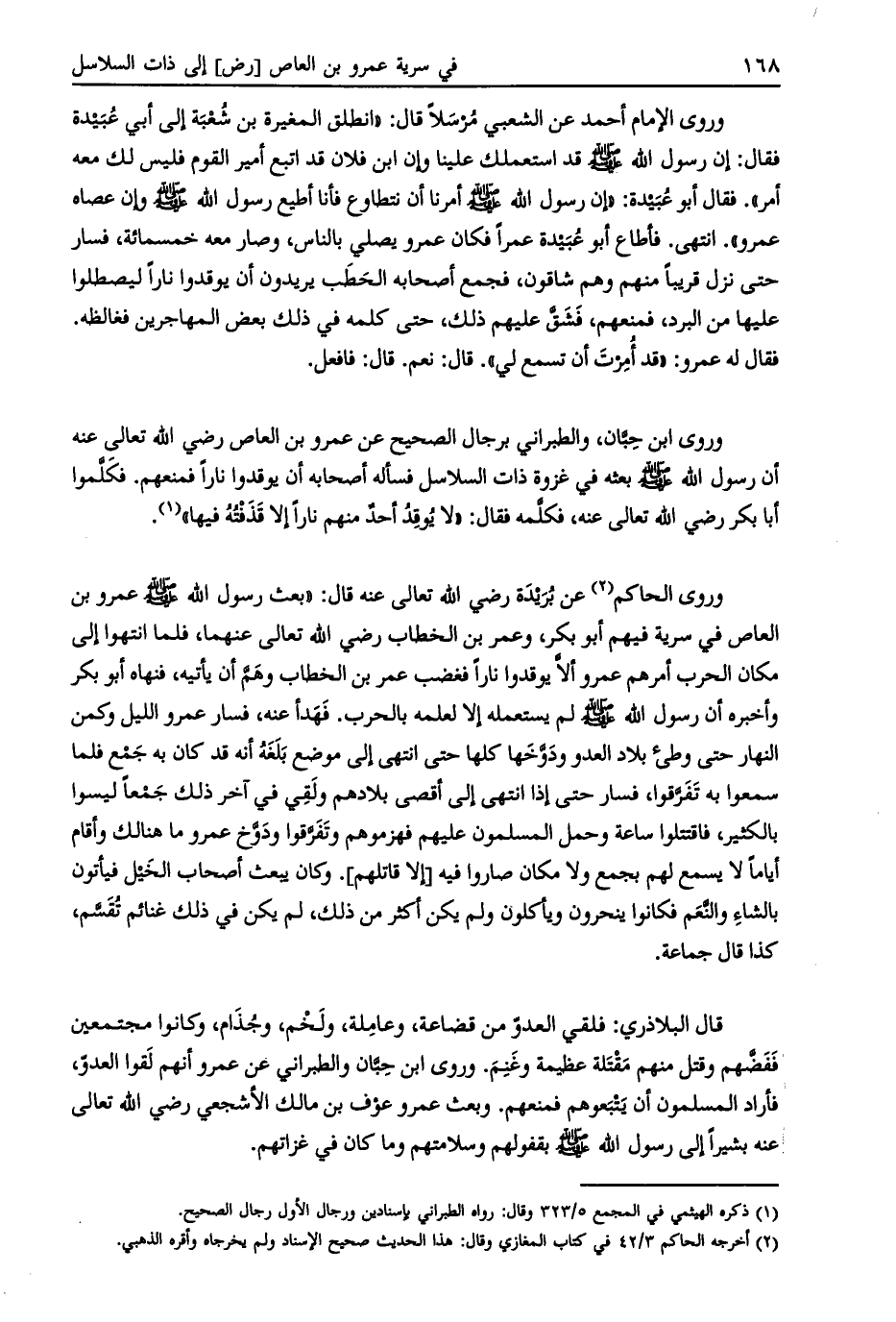 وروى الحاكم [ (2) ] عن بريدة رضي الله تعالى عنه قال: «بعث رسول الله صلى الله عليه وسلّم عمرو بن العاص في سرية فيهم أبو بكر، وعمر بن الخطاب رضي الله تعالى عنهما، فلما انتهوا إلى مكان الحرب أمرهم عمرو ألّا يوقدوا نارا فغضب عمر بن الخطاب وهمّ أن يأتيه، فنهاه أبو بكر وأخبره أن رسول الله صلى الله عليه وسلم لم يستعمله إلا لعلمه بالحرب. فهدأ عنه، فسار عمرو الليل وكمن النهار حتى وطئ بلاد العدو ودوّخها كلها حتى انتهى إلى موضع بلغه أنه قد كان به جمع فلما سمعوا به تفرّقوا، فسار حتى إذا انتهى إلى أقصى بلادهم ولقي في آخر ذلك جمعا ليسوا بالكثير، فاقتتلوا ساعة وحمل المسلمون عليهم فهزموهم وتفرّقوا ودوّخ عمرو ما هنا لك وأقام أياما لا يسمع لهم بجمع ولا مكان صاروا فيه [إلا قاتلهم] . وكان يبعث أصحاب الخيل فيأتون بالشاء والنّعم فكانوا ينحرون ويأكلون ولم يكن أكثر من ذلك، لم يكن في ذلك غنائم تقسّم، كذا قال جماعة.