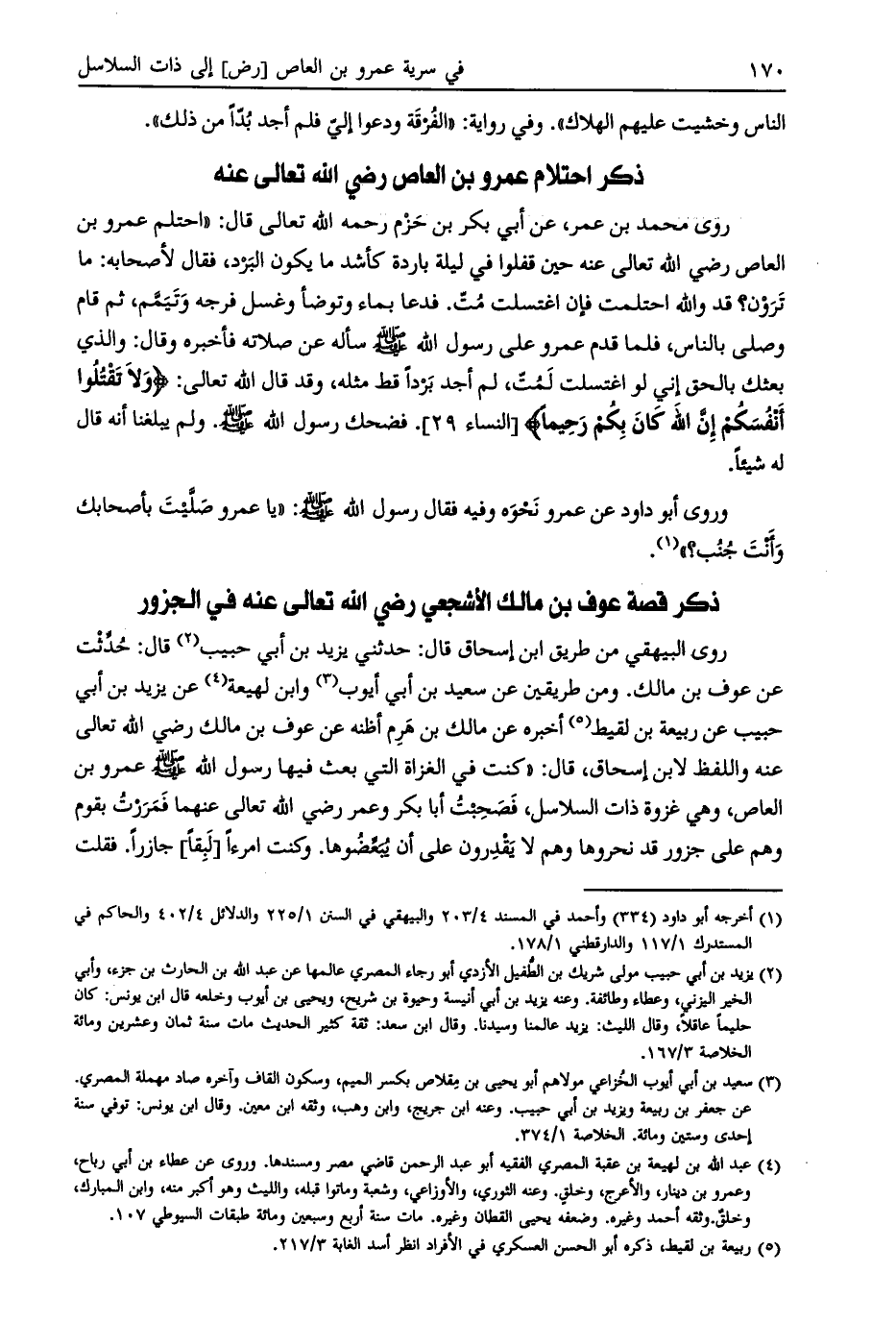 روى البيهقي من طريق ابن إسحاق قال: حدثني يزيد بن أبي حبيب [ (2) ] قال: حدثت عن عوف بن مالك. ومن طريقين عن سعيد بن أبي أيوب [ (3) ] وابن لهيعة [ (4) ] عن يزيد بن أبي حبيب عن ربيعة بن لقيط [ (5) ] أخبره عن مالك بن هرم أظنه عن عوف بن مالك رضي الله تعالى عنه واللفظ لابن إسحاق، قال: «كنت في الغزاة التي بعث فيها رسول الله صلى الله عليه وسلّم عمرو بن العاص، وهي غزوة ذات السلاسل، فصحبت أبا بكر وعمر رضي الله تعالى عنهما فمررت بقوم وهم على جزور قد نحروها وهم لا يقدرون على أن يبعّضوها. وكنت امرأ [لبقا] جازرا. فقلت