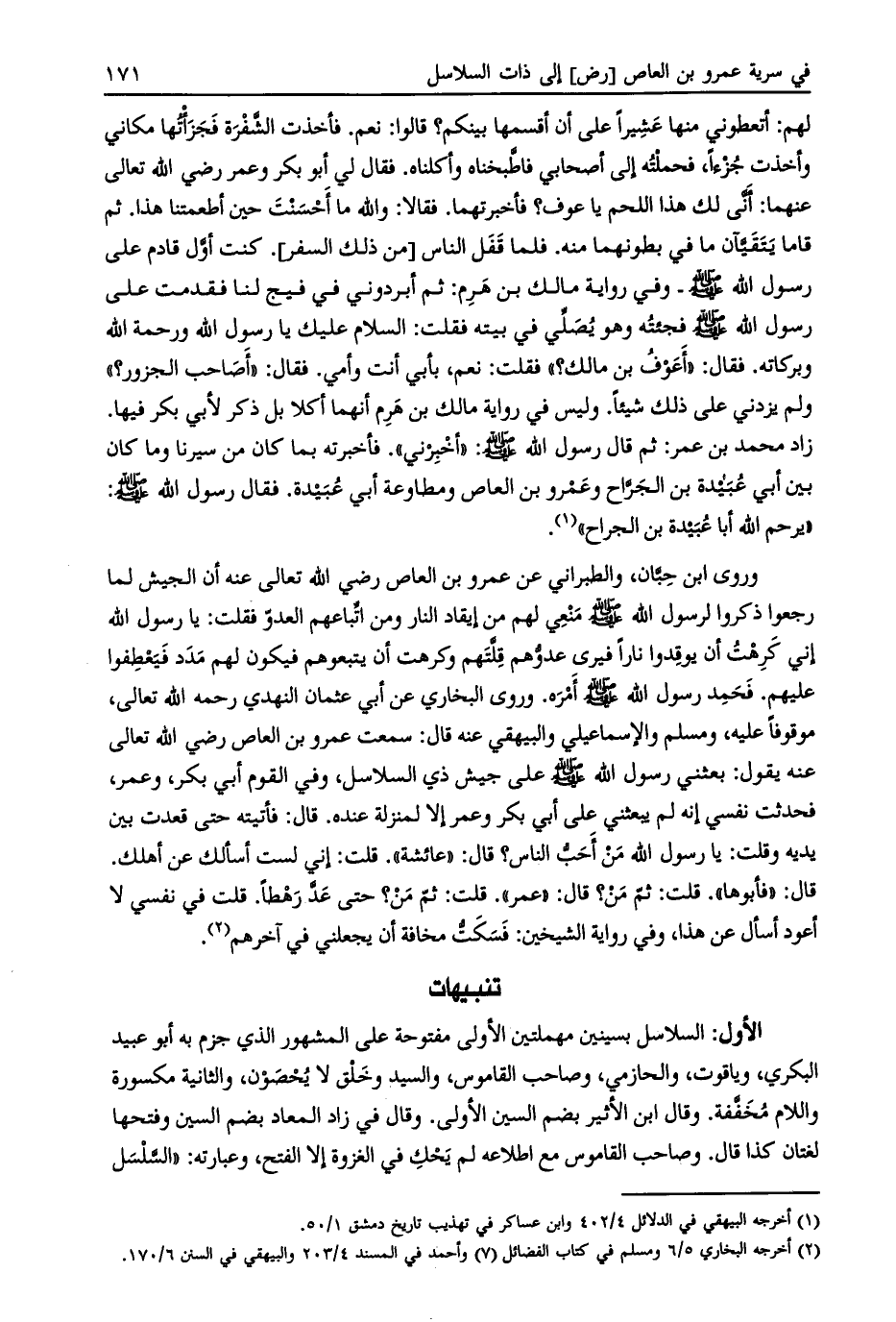 وروى البخاري عن أبي عثمان النهدي رحمه الله تعالى، موقوفا عليه، ومسلم والإسماعيلي والبيهقي عنه قال: سمعت عمرو بن العاص رضي الله تعالى عنه يقول: بعثني رسول الله صلى الله عليه وسلم على جيش ذي السلاسل، وفي القوم أبي بكر، وعمر، فحدثت نفسي إنه لم يبعثني على أبي بكر وعمر إلا لمنزلة عنده. قال: فأتيته حتى قعدت بين يديه وقلت: يا رسول الله من أحبّ الناس؟ قال: «عائشة» . قلت: إني لست أسألك عن أهلك.