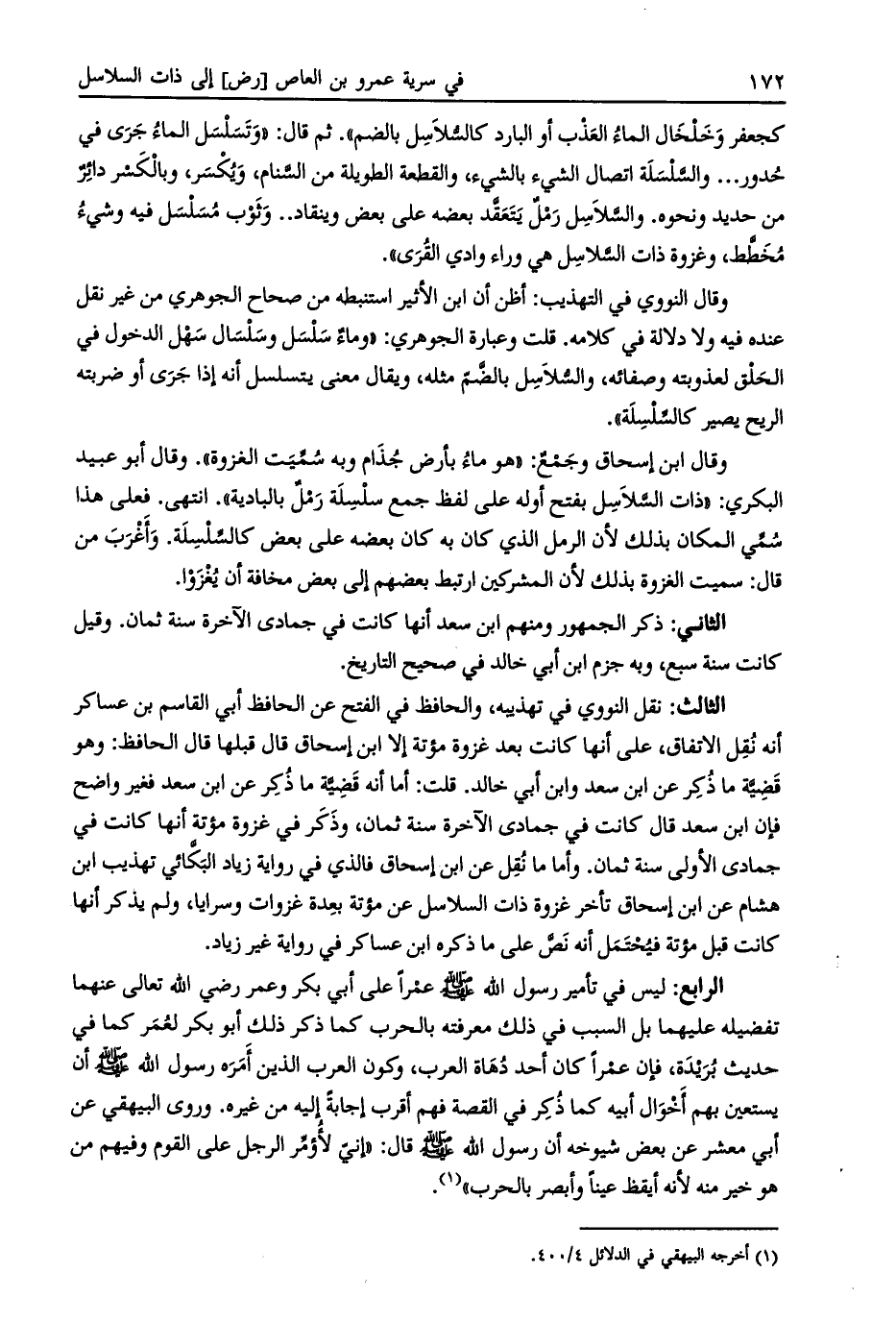 الثالث: نقل النووي في تهذيبه، والحافظ في الفتح عن الحافظ أبي القاسم بن عساكر أنه نقل الاتفاق، على أنها كانت بعد غزوة مؤتة إلا ابن إسحاق قال قبلها قال الحافظ: وهو قضيّة ما ذكر عن ابن سعد وابن أبي خالد. قلت: أما أنه قضيّة ما ذكر عن ابن سعد فغير واضح فإن ابن سعد قال كانت في جمادى الآخرة سنة ثمان، وذكر في غزوة مؤتة إنها كانت في جمادى الأولى سنة ثمان. وأما ما نقل عن ابن إسحاق فالذي في رواية زياد البكّائي تهذيب ابن هشام عن ابن إسحاق تأخر غزوة ذات السلاسل عن مؤتة بعدة غزوات وسرايا، ولم يذكر أنها كانت قبل مؤتة فيحتمل أنه نصّ على ما ذكره ابن عساكر في رواية غير زياد.