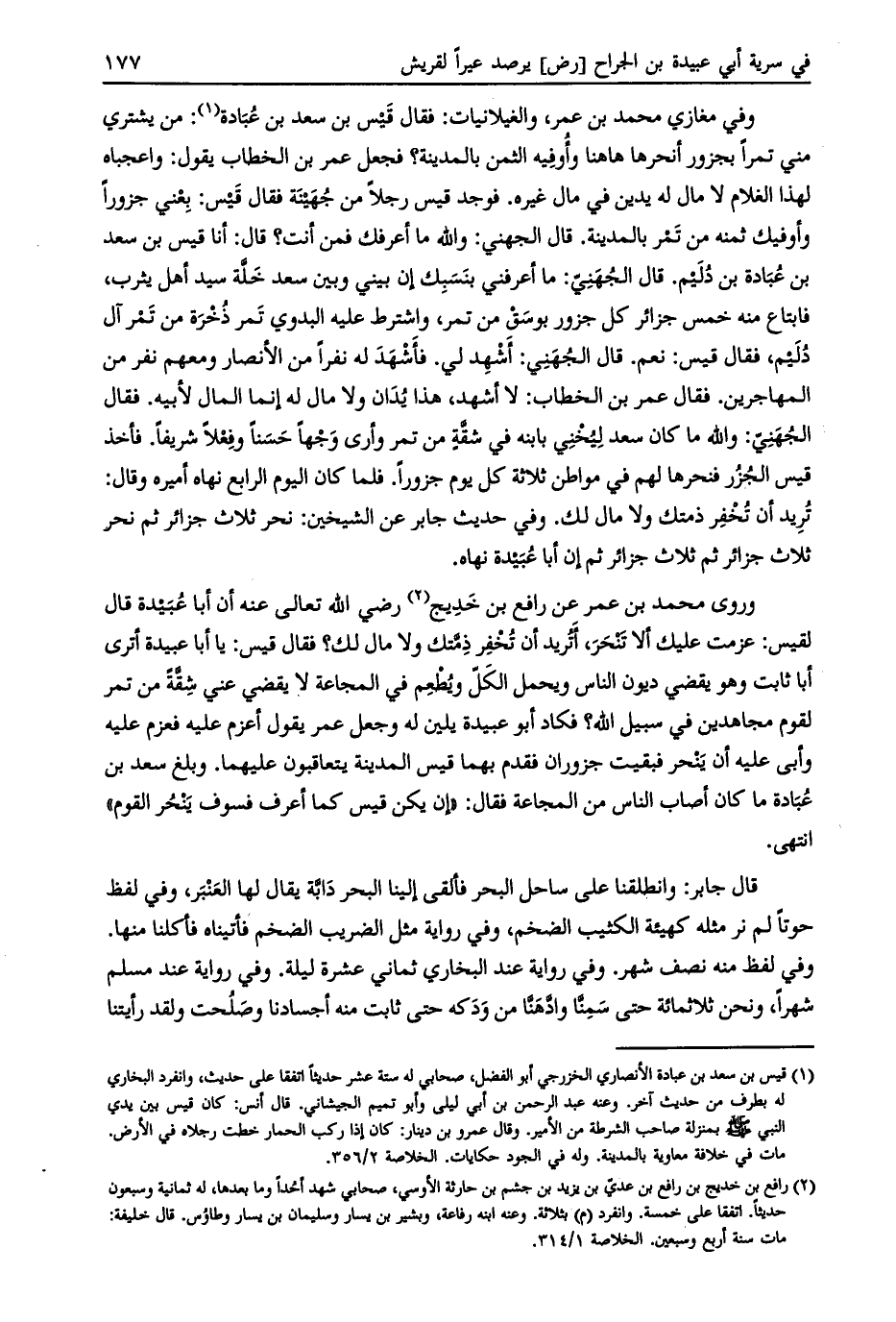 وروى محمد بن عمر عن رافع بن خديج [ (2) ] رضي اللَّه تعالى عنه أن أبا عبيدة قال لقيس: عزمت عليك ألا تنحر، أتريد أن تخفر ذمّتك ولا مال لك؟ فقال قيس: يا أبا عبيدة أترى أبا ثابت وهو يقضي ديون الناس ويحمل الكلّ ويطعم في المجاعة لا يقضي عني شقّة من تمر لقوم مجاهدين في سبيل اللَّه؟ فكاد أبو عبيدة يلين له وجعل عمر يقول أعزم عليه فعزم عليه وأبي عليه أن ينحر فبقيت جزوران فقدم بهما قيس المدينة يتعاقبون عليهما. وبلغ سعد بن عبادة ما كان أصاب الناس من المجاعة فقال: «إن يكن قيس كما أعرف فسوف ينحر القوم» انتهى.