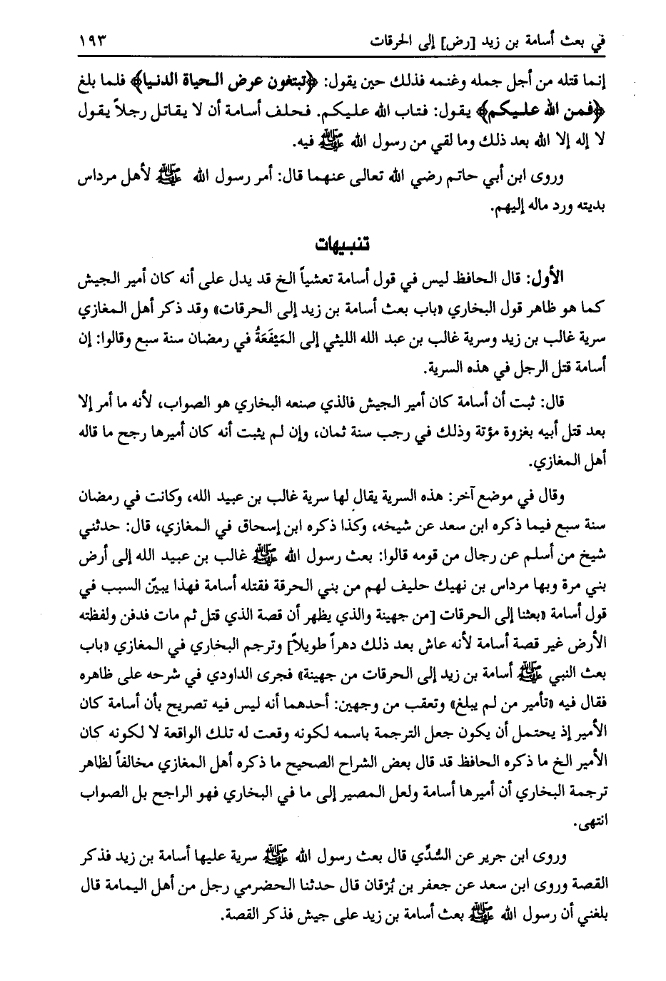 الأول: قال الحافظ ليس في قول أسامة تعشيا إلخ قد يدل على انه كان أمير الجيش كما هو ظاهر قول البخاري «باب بعث أسامة بن زيد إلى الحرقات» وقد ذكر أهل المغازي سرية غالب بن زيد وسرية غالب بن عبد اللَّه الليثي إلى الميفعة في رمضان سنة سبع وقالوا: إن أسامة قتل الرجل في هذه السرية.