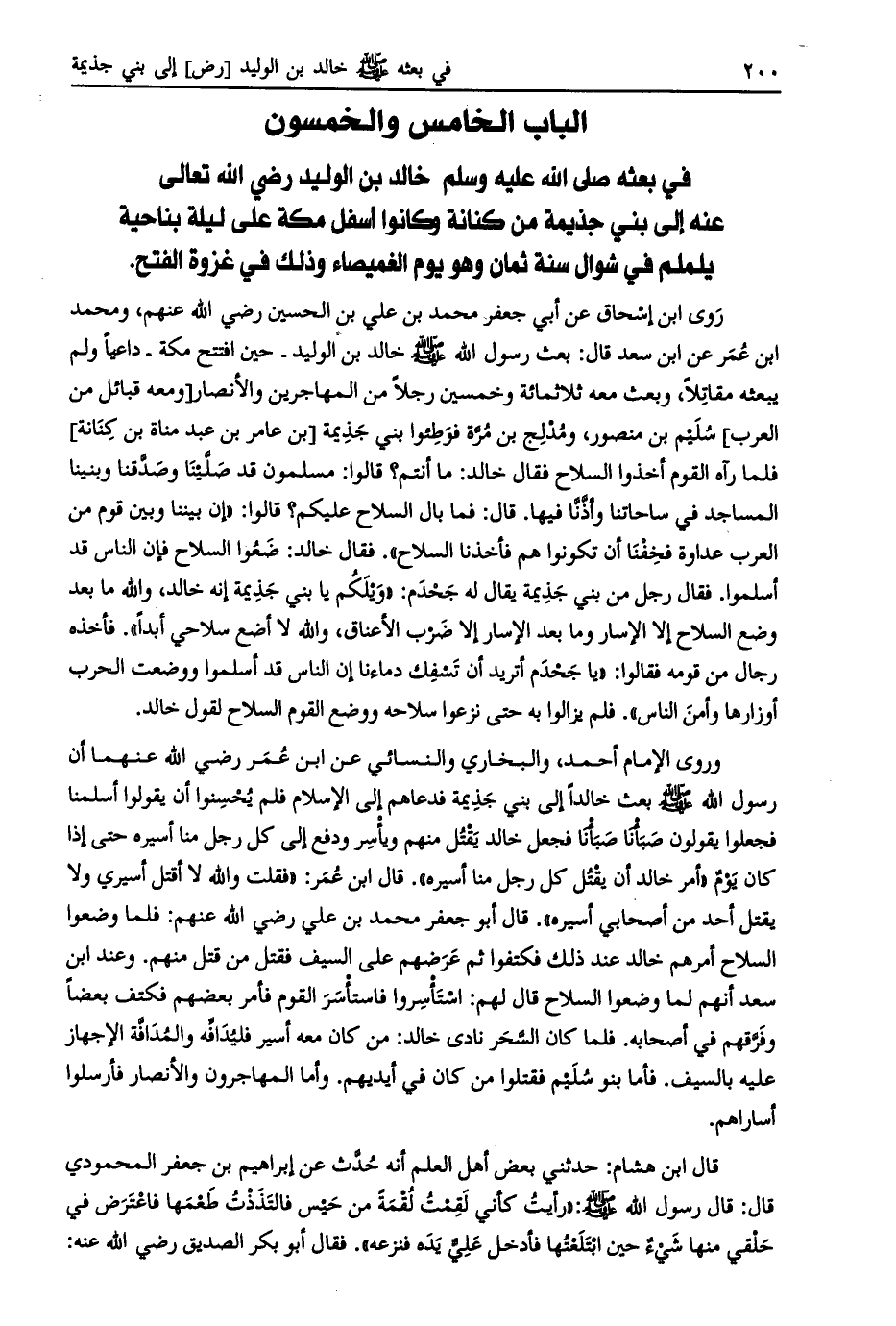 وروى الإمام أحمد، والبخاري والنسائي عن ابن عمر رضي اللَّه عنهما ان رسول اللَّه صلى اللَّه عليه وسلم بعث خالدا إلى بني جذيمة فدعاهم إلى الإسلام فلم يحسنوا أن يقولوا أسلمنا فجعلوا يقولون صبأنا صبأنا فجعل خالد يقتل منهم ويأسر ودفع إلى كل رجل منا أسيره حتى إذا كان يوم «أمر خالد أن يقتل كل رجل منا أسيره» . قال ابن عمر: «فقلت واللَّه لا أقتل أسيري ولا يقتل أحد أمن أصحابي أسيره» . قال أبو جعفر محمد بن علي رضي اللَّه عنهم: فلما وضعوا السلاح أمرهم خالد عند ذلك فكتفوا ثم عرضهم على السيف فقتل من قتل منهم. وعند ابن سعد أنهم لما وضعوا السلاح قال لهم: استأسروا فاستأسر القوم فأمر بعضهم فكتف بعضا وفرّقهم في أصحابه. فلما كان السّحر نادى خالد: من كان معه أسير فليدافّه والمدافّة الإجهاز عليه بالسيف. فأما بنو سليم فقتلوا من كان في أيديهم. وأما المهاجرون والأنصار فأرسلوا أساراهم.
