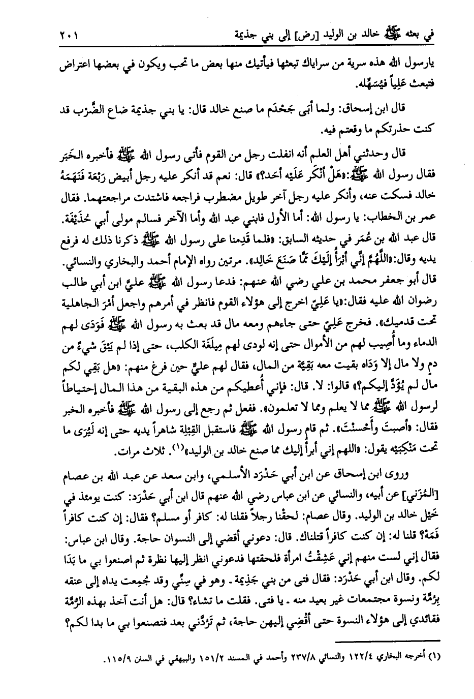 قال عبد اللَّه بن عمر في حديثه السابق: «فلما قدمنا على رسول اللَّه صلى اللَّه عليه وسلم ذكرنا ذلك له فرفع يديه وقال: «اللهم إني أبرأ إليك ممّا يصنع خالد» . مرتين رواه الإمام أحمد والبخاري والنسائي.