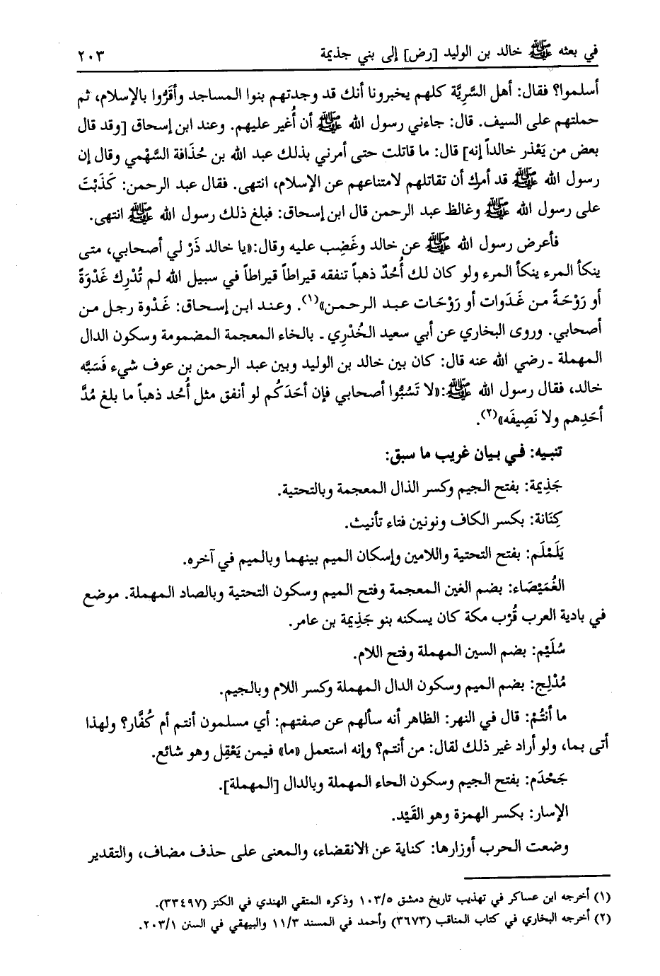 فأعرض رسول اللَّه صلى اللَّه عليه وسلم عن خالد وغضب عليه وقال: «يا خالد ذر لي أصحابي، متى ينكأ المرء ينكأ المرء ولو كان لك أحد ذهبا تنفقه قيراطا قيراطا في سبيل اللَّه لم تدرك غدوة أو روحة من غدوات أو روحات عبد الرحمن» [ (1) ] .