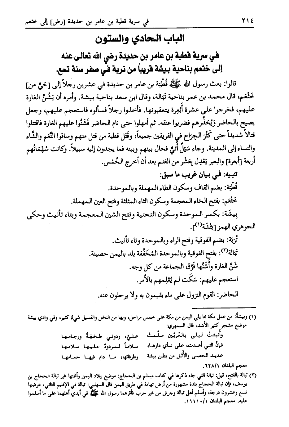 الباب الحادي والستون في سرية قطبة بن عامر بن حديدة رضي الله تعالى عنه إلى خثعم بناحية بيشة قريبا من تربة في صفر سنة تسع.