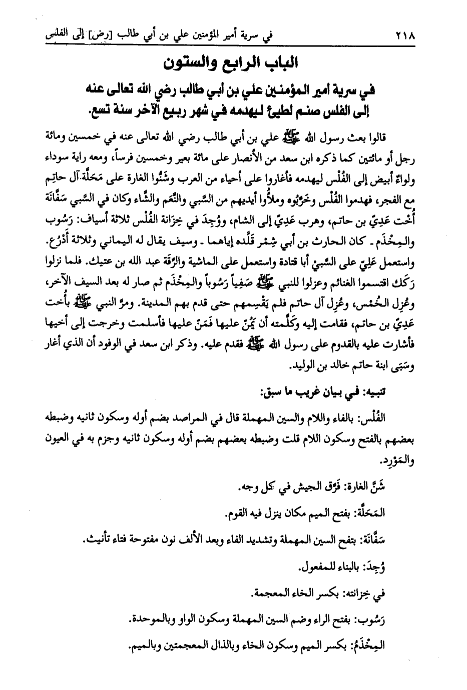 الباب الرابع والستون في سرية أمير المؤمنين علي بن أبي طالب رضي الله تعالى عنه إلى الفلس صنم لطي ليهدمه في شهر ربيع الآخر سنة تسع.
