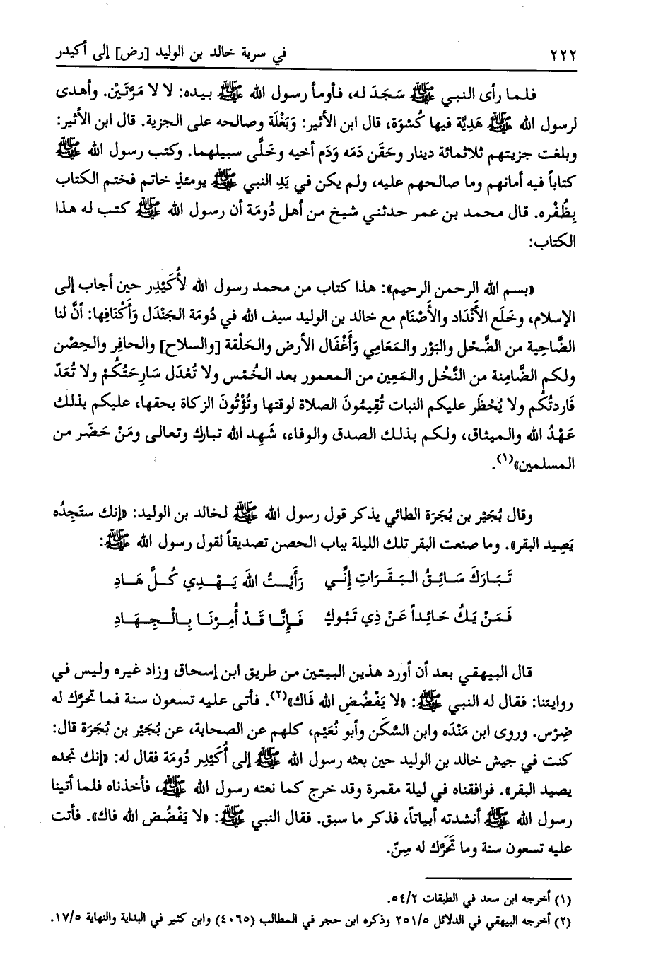 قال محمد بن عمر حدثني شيخ من أهل دومة أن رسول الله صلى الله عليه وسلم كتب له هذا الكتاب: «بسم الله الرحمن الرحيم» : هذا كتاب من محمد رسول الله لأكيدر حين أجاب إلى الإسلام، وخلع الأنداد والأصنام مع خالد بن الوليد سيف الله في دومة الجندل وأكنافها: أنّ لنا الضّاحية من الضّحل والبور والمعامي وأغفال الأرض والحلقة [والسلاح] والحافر والحصن ولكم الضّامنة من النّخل والمعين من المعمور بعد الخمس ولا تعدل سارحتكم ولا تعدّ فاردتكم ولا يحظر عليكم النبات تقيمون الصلاة لوقتها وتؤتون الزكاة بحقها، عليكم بذلك عهد الله والميثاق، ولكم بذلك الصدق والوفاء، شهد الله تبارك وتعالى ومن حضر من المسلمين» [ (1) ] .