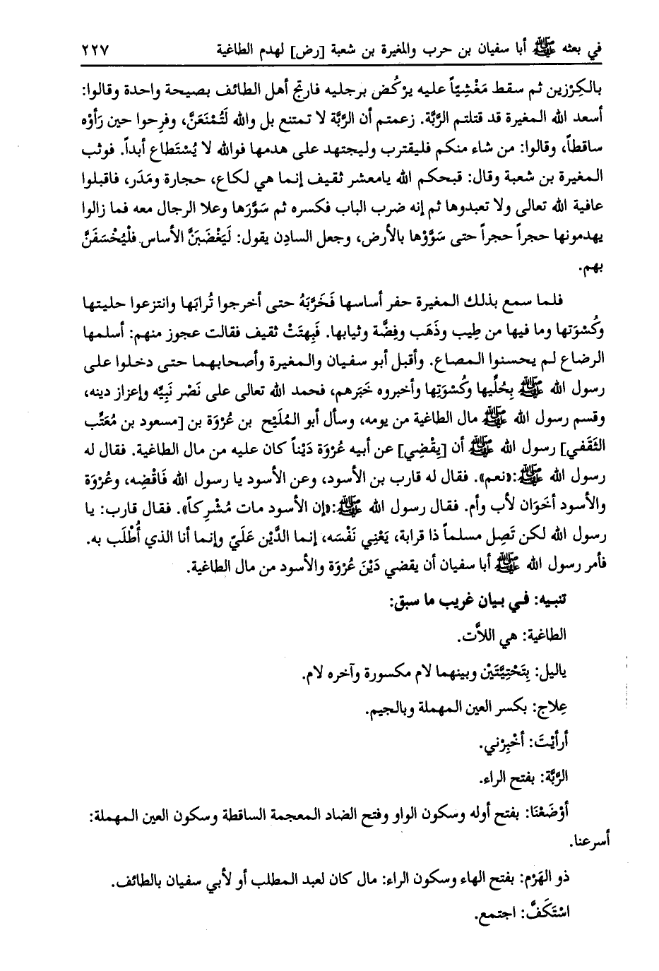 أسعد اللَّه المغيرة قد قتلتم الرّبّة. زعمتم أن الرّبّة لا تمتنع بل واللَّه لتمنعنّ، وفرحوا حين رأوه ساقطا، وقالوا: من شاء منكم فليقترب وليجتهد على هدمها فو اللَّه لا يستطاع أبدا. فوثب المغيرة بن شعبة وقال: قبحكم اللَّه يا معشر ثقيف إنما هي لكاع، حجارة ومدر، فاقبلوا عافية اللَّه تعالى ولا تعبدوها ثم إنه ضرب الباب فكسره ثم سوّرها وعلا الرجال معه فما زالوا يهدمونها حجرا حجرا حتى سوّوها بالأرض، وجعل السادن يقول: ليغضبنّ الأساس فليخسفنّ بهم.