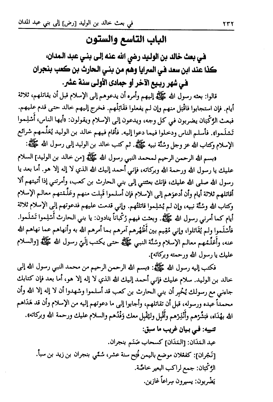«بسم الله الرحمن الرحيم لمحمد النبي رسول الله صلى الله عليه وسلم [من خالد بن الوليد] السلام عليك يا رسول الله ورحمة الله وبركاته، فإني أحمد إليك اللَّه الذي لا إله إلا هو. أما بعد يا رسول اللَّه صلى اللَّه عليك، فإنك بعثتني إلى بني الحارث بن كعب، وأمرتني إذا أتيتهم ألا أقاتلهم ثلاثة أيام وأن أدعوهم إلى الإسلام فإن أسلموا قبلت منهم وعلّمتهم معالم الإسلام وكتاب اللَّه وسنة نبيه، وإن لم يسلموا قاتلتهم. وإني قدمت عليهم فدعوتهم إلى الإسلام ثلاثة أيام كما أمرني رسول اللَّه صلى اللَّه عليه وسلم. وبعث فيهم ركبانا ينادون: يا بني الحارث أسلموا تسلموا.