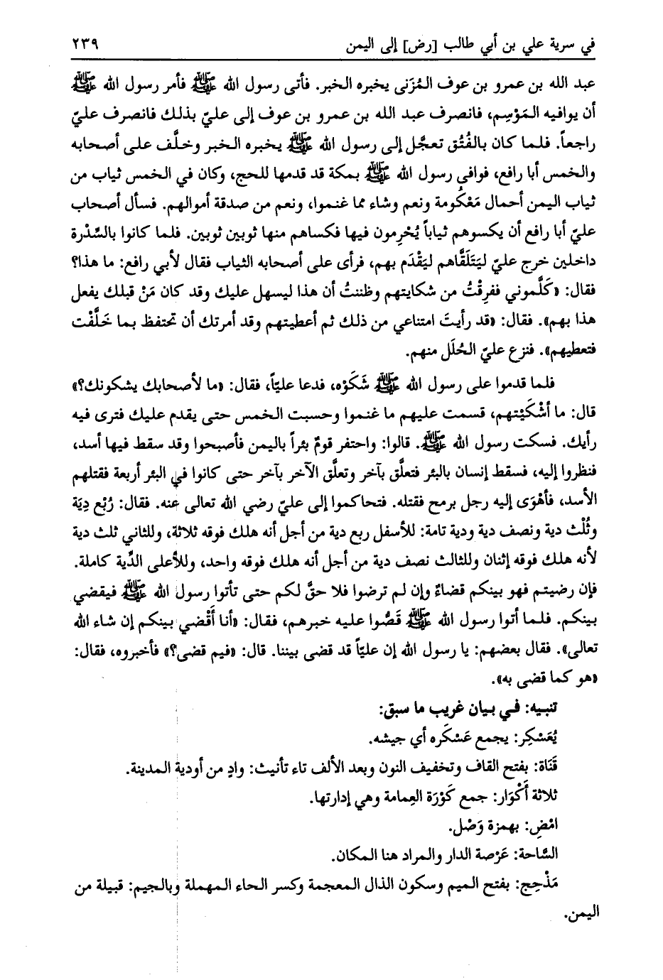 عبد الله بن عمرو بن عوف المزني يخبره الخبر. فأتى رسول الله صلى الله عليه وسلم فأمر رسول الله صلى الله عليه وسلم أن يوافيه الموسم، فانصرف عبد الله بن عمرو بن عوف إلى عليّ بذلك فانصرف عليّ راجعا. فلما كان بالفتق تعجّل إلى رسول الله صلى الله عليه وسلم يخبره الخبر وخلّف على أصحابه والخمس أبا رافع، فوافى رسول الله صلى الله عليه وسلم بمكة قد قدمها للحج، وكان في الخمس ثياب من ثياب اليمن أحمال معكومة ونعم وشاء مما غنموا، ونعم من صدقة أموالهم. فسأل أصحاب عليّ أبا رافع إن يكسوهم ثيابا يحرمون فيها فكساهم منها ثوبين ثوبين. فلما كانوا بالسّدرة داخلين خرج عليّ ليتلقّاهم ليقدم بهم، فرأى على أصحابه الثياب