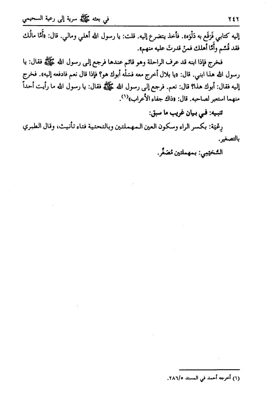 فخرج فإذا ابنه قد عرف الراحلة وهو قائم عندها فرجع إلى رسول الله صلى الله عليه وسلم فقال: يا رسول الله هذا ابني. قال: «يا بلال أخرج معه فسله أبوك هو؟ فإذا قال نعم فادفعه إليه» . فخرج إليه فقال: أبوك هذا؟ قال: نعم. فرجع إلى رسول الله صلى الله عليه وسلم فقال: يا رسول الله ما رأيت أحدا منهما استعبر لصاحبه. قال: «ذاك جفاء الأعراب» [ (1) ] .
