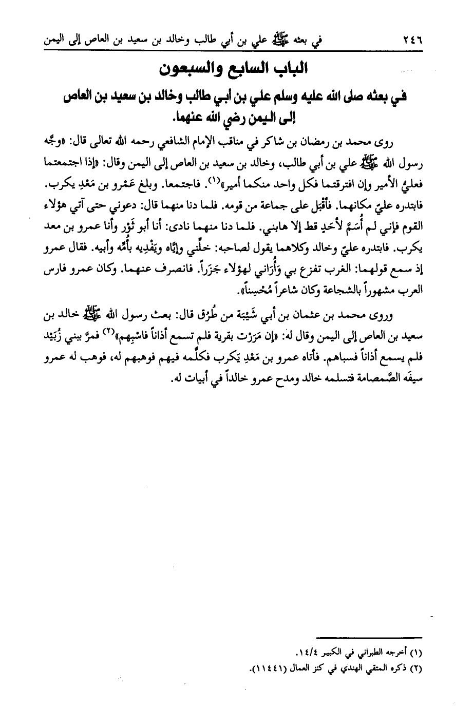 الباب السابع والسبعون في بعثة صلّى الله عليه وسلم علي بن أبي طالب وخالد بن سعيد بن العاص إلى اليمن رضي الله عنهما.