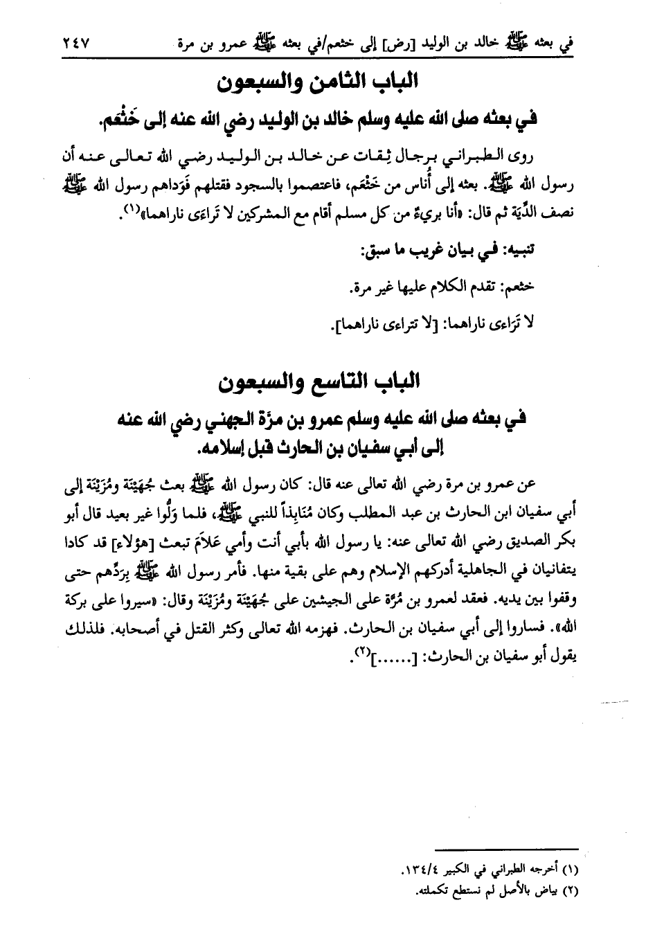 الباب التاسع والسبعون في بعثة صلّى الله عليه وسلّم عمرو بن مرة الجهني رضي الله عنه إلى أبي سفيان بن الحارث قبل إسلامه.