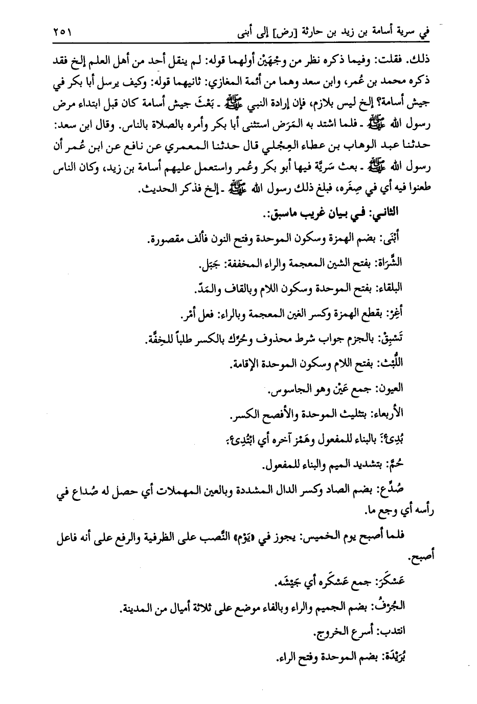 ذلك. فقلت: وفيما ذكره نظر من وجهين أولهما قوله: لم ينقل أحد من أهل العلم إلخ فقد ذكره محمد بن عمر، وابن سعد وهما من أئمة المغازي: ثانيهما قوله: وكيف يرسل أبا بكر في جيش أسامة؟ إلخ ليس بلازم، فإن إرادة النبي صلى الله عليه وسلم- بعث جيش أسامة كان قبل ابتداء مرض رسول الله صلى الله عليه وسلم- فلما اشتد به المرض استثنى أبا بكر وأمره بالصلاة بالناس. وقال ابن سعد: