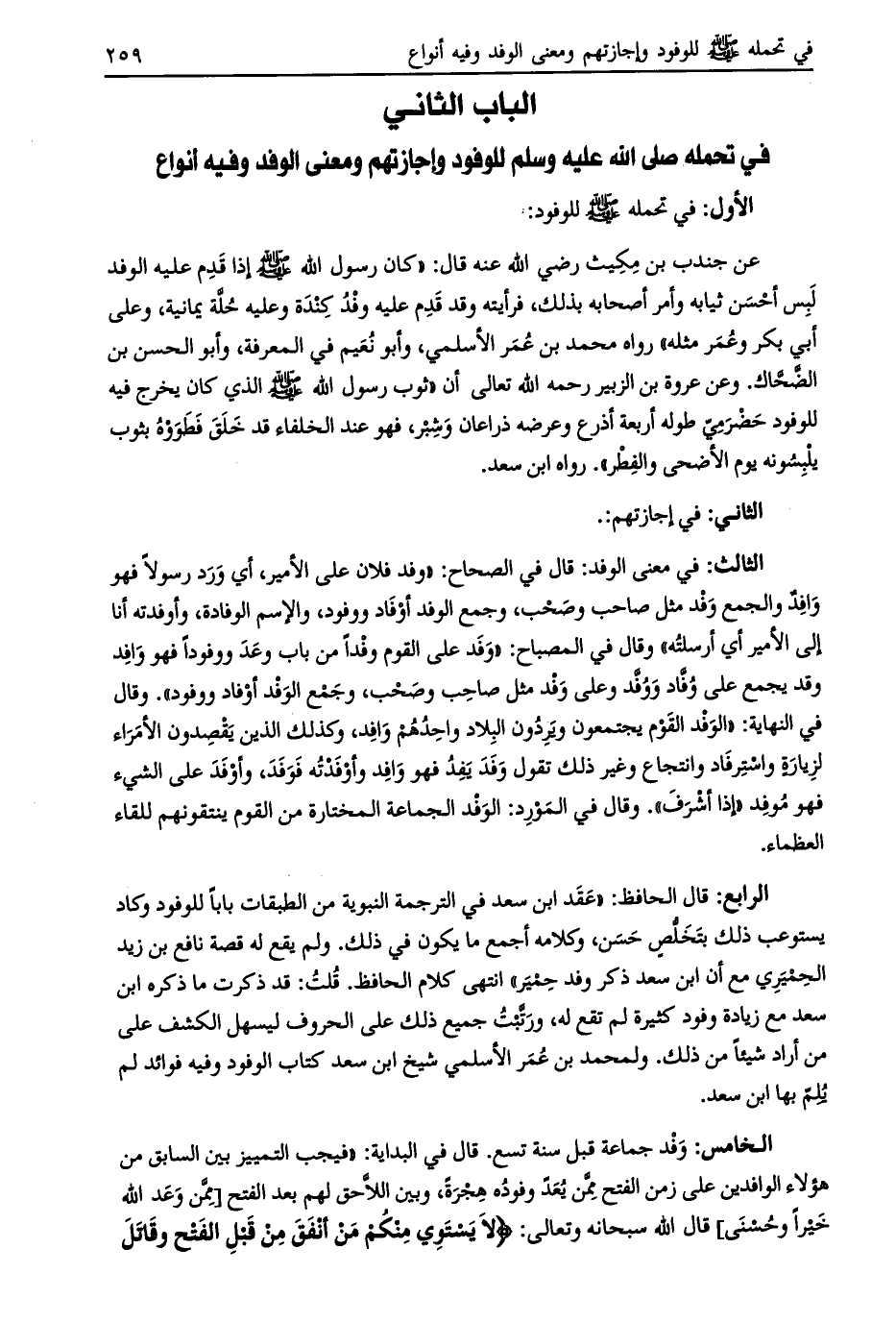 الرابع: قال الحافظ: «عقد ابن سعد في الترجمة النبوية من الطبقات بابا للوفود وكاد يستوعب ذلك بتخلّص حسن، وكلامه أجمع ما يكون في ذلك. ولم يقع له قصة نافع بن زيد الحميري مع أن ابن سعد ذكر وفد حمير» انتهى كلام الحافظ. قلت: قد ذكرت ما ذكره ابن سعد مع زيادة وفود كثيرة لم تقع له، ورتّبت جميع ذلك على الحروف ليسهل الكشف على من أراد شيئا من ذلك. ولمحمد بن عمر الأسلمي شيخ ابن سعد كتاب الوفود وفيه فوائد لم يلمّ بها ابن سعد.