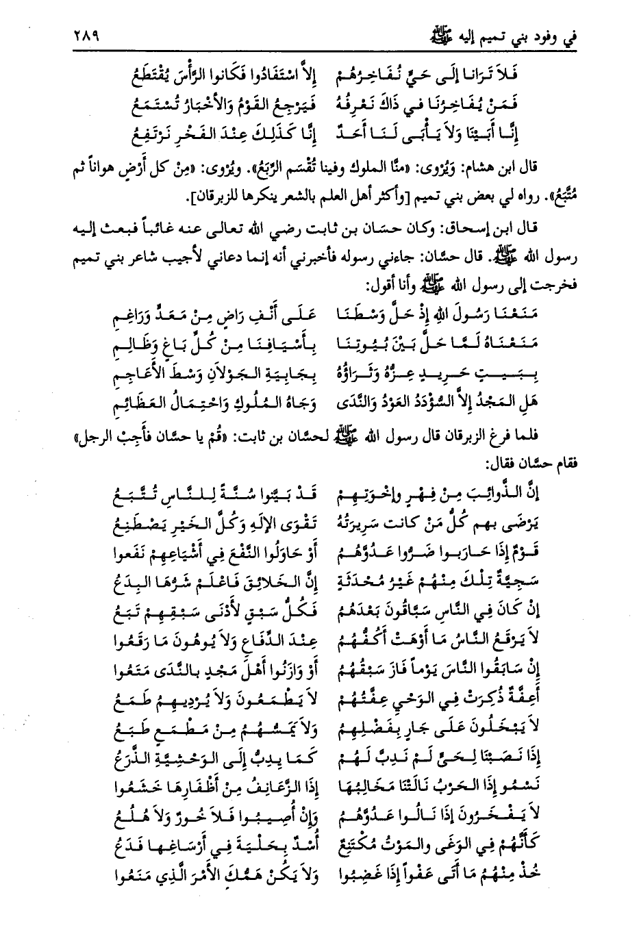 قال ابن إسحاق: وكان حسان بن ثابت رضي الله تعالى عنه غائبا فبعث إليه رسول الله صلى الله عليه وسلم. قال حسّان: جاءني رسوله فأخبرني أنه إنما دعاني لأجيب شاعر بني تميم فخرجت إلى رسول الله صلى الله عليه وسلم وأنا أقول:
