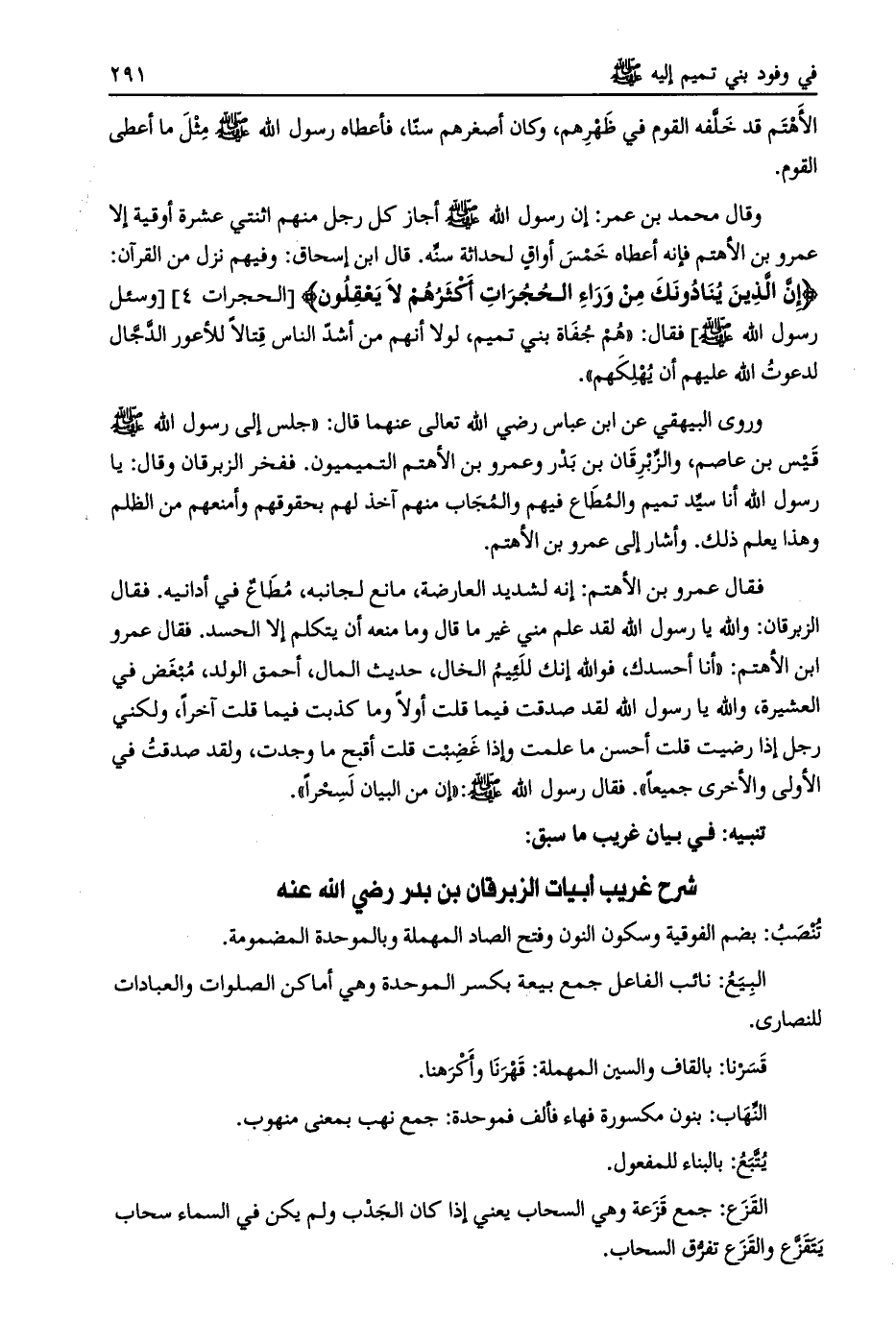 وروى البيهقي عن ابن عباس رضي الله تعالى عنهما قال: «جلس إلى رسول الله صلى الله عليه وسلم قيس بن عاصم، والزّبرقان بن بدر وعمرو بن الأهتم التميميون. ففخر الزبرقان وقال: يا رسول الله أنا سيّد تميم والمطاع فيهم والمجاب منهم آخذ لهم بحقوقهم وأمنعهم من الظلم وهذا يعلم ذلك. وأشار إلى عمرو بن الأهتم.