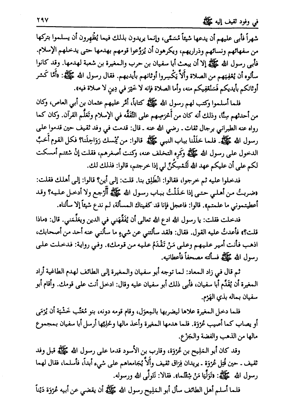 وقد كانوا سألوه أن يعفيهم من الصلاة وألّا يكسروا أوثانهم بأيديهم. فقال رسول الله صلى الله عليه وسلم: «أمّا كسر أوثانكم بأيديكم فسنعفيكم منه، وأما الصلاة فإنه لا خير في دين لا صلاة فيه» .
