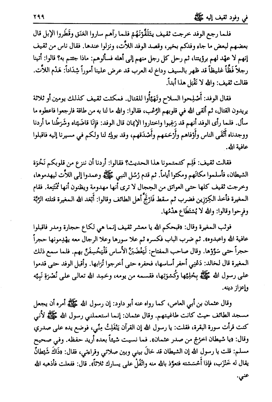 فقال الوفد: أصلحوا السلاح وتهيّئوا للقتال. فمكثت ثقيف كذلك يومين أو ثلاثة يريدون القتال، ثم ألقى الله في قلوبهم الرّعب، فقالوا: والله ما لنا به من طاقة فارجعوا فأعطوه ما سأل. فلما رأى الوفد إنهم قد رغبوا واختاروا الإيمان قال الوفد: فإنا قاضيناه وشرطنا ما أردنا ووجدناه أتقى الناس وأوفاهم وأرحمهم وأصدقهم، وقد بورك لنا ولكم في مسيرنا إليه فاقبلوا عافية الله.