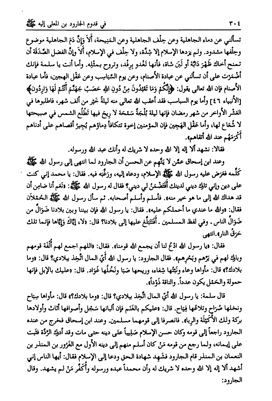وعند ابن إسحاق عمّن لا يتّهم عن الحسن أن الجارود لما انتهى إلى رسول الله صلى الله عليه وسلم كلّمه فعرض عليه رسول الله صلى الله عليه وسلم الإسلام، ودعاه إليه، ورغّبة فيه. فقال: يا محمد إني كنت على دين وإني تارك ديني لدينك أفتضمن لي ديني؟ فقال له رسول الله صلى الله عليه وسلم: «نعم أنا ضامن أن قد هداك الله إلى ما هو خير منه» . فأسلم وأسلم أصحابه. ثم سأل رسول الله صلى الله عليه وسلم الحملان فقال: «والله ما عندي ما أحملكم عليه» . فقال: يا رسول الله فإن بيننا وبين بلادنا ضوال من ضوال الناس- وفي لفظ المسلمين- أفنتبلّغ عليها إلى بلادنا؟ قال: «لا، إيّاك وإيّاها فإنما تلك حرق النار»