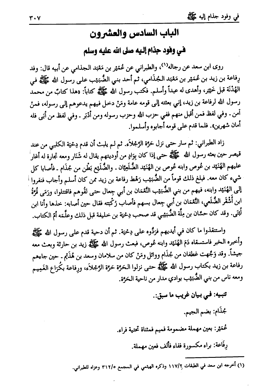روى ابن سعد عن رجاله [ (1) ] ، والطبراني عن عمير بن معبد الجذامي عن أبيه قال: وفد رفاعة بن زيد بن عمير بن معبد الجذامي، ثم أحد بني الضّبيب على رسول الله صلى الله عليه وسلم في الهدنة قبل خيبر، وأهدى له عبدا وأسلم. فكتب رسول الله صلى الله عليه وسلم كتابا: «هذا كتاب من محمد رسول الله لرفاعة بن زيد، إني بعثته إلى قومه عامة ومن دخل فيهم يدعوهم إلى رسوله، فمن آمن- وفي لفظ فمن أقبل منهم ففي حزب الله وحزب رسوله ومن أدبر- وفي لفظ من أبي فله أمان شهرين» .