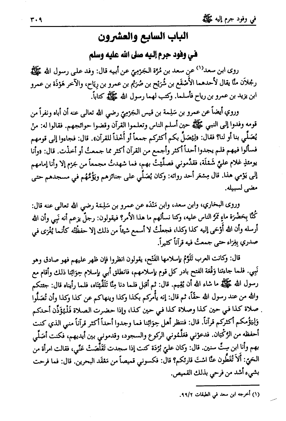 قال: فجاءوا إلى قومهم فسألوا فيهم فلم يجدوا أحدا أكثر وأجمع من القرآن أكثر مما جمعت أو أخذت. قال: «وأنا يومئذ غلام عليّ شملة، فقدّموني فصلّيت بهم، فما شهدت مجمعا من جرم إلا وأنا إمامهم إلى يومي هذا. قال: مسعر أحد رواته: وكان يصلي على جنائزهم ويؤمّهم في مسجدهم حتى مضى لسبيله.