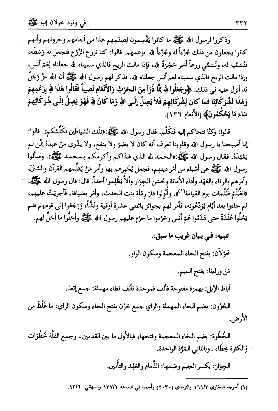 إنا أصبحنا يا رسول الله وقلوبنا تعرف أنه كان لا يضرّ ولا ينفع، ولا يدري من عبده ممّن لم يعبده. فقال رسول الله صلى الله عليه وسلم: «الحمد لله الذي هداكم وأكرمكم بمحمد صلى الله عليه وسلم» . وسألوا رسول الله صلى الله عليه وسلم عن أشياء من أمر دينهم، فجعل يخبرهم بها وأمر من يعلّمهم القرآن والسّنن، وأمرهم بالوفاء بالعهد وأداء الأمانة وحسن الجوار وألّا يظلموا أحدا. قال: قال رسول الله صلى الله عليه وسلم: