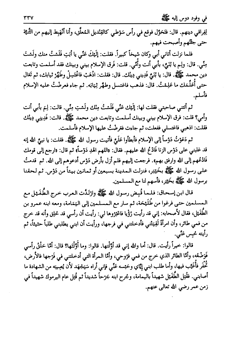 قالوا: خيرا رأيت. قال: أما واللَّه إني قد أوّلتها. قالوا: وما أوّلتها؟ قال: أمّا حلق رأسي فوضعه، وأمّا الطائر الذي خرج من فمي فروحي، وأمّا المرأة التي أدخلتني في فرجها فالأرض، تحفر فأغيب فيها، وأما طلب ابني إيّاي وحبسه عنّي فإني أراه سيجهد لأن يصيبه من الشهادة ما أصابني. فقتل الطّفيل شهيدا باليمامة، وجرح ابنه جرحا شديدا ثم قتل عام اليرموك شهيدا في زمن عمر رضي اللَّه تعالى عنهم.