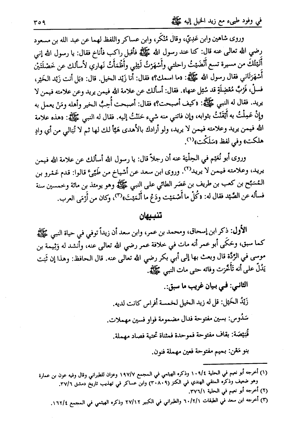 وروى شاهين وابن عديّ، وقال منكر، وابن عساكر واللفظ لهما عن عبد اللَّه بن مسعود رضي اللَّه تعالى عنه قال: كنا عند رسول اللَّه صلى اللَّه عليه وسلم فأقبل راكب فأناخ فقال: يا رسول اللَّه إني أتيتك من مسيرة تسع أنضيت راحلتي وأسهرت ليلي وأظمأت نهاري لأسألك عن خصلتين أسهرتاني فقال رسول اللَّه صلى اللَّه عليه وسلم: «ما اسمك؟» فقال: أنا زيد الخيل. قال: «بل أنت زيد الخير، فسل، فربّ معضلة قد سئل عنها» . فقال: أسألك عن علامة اللَّه فيمن يريد وعن علامته فيمن لا يريد. فقال له النبي صلى اللَّه عليه وسلم: «كيف أصبحت؟» فقال: أصبحت أحبّ الخير وأهله ومن يعمل به وإن عملت به أيقنت بثوابه، وإن فاتني منه شيء حننت إليه. فقال له النبي صلى اللَّه عليه وسلم: «هذه علامة اللَّه فيمن يريد وعلامته فيمن لا يريد، ولو أرادك بالأهدى هيّأ لك لها ثم لا تبالي من أي واد هلكت» وفي لفظ «سلكت» [ (1) ] .