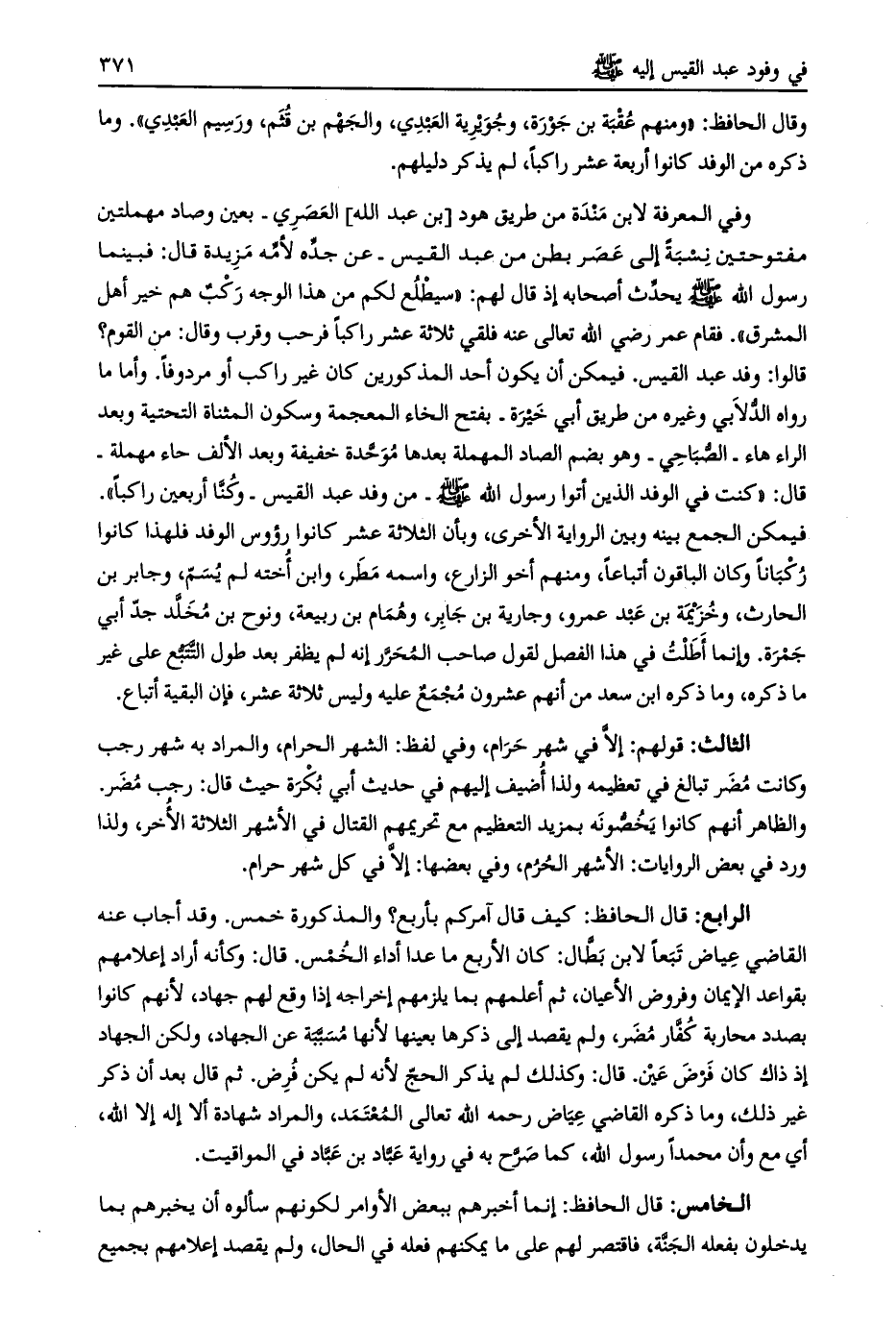 فيمكن الجمع بينه وبين الرواية الأخرى، وبأن الثلاثة عشر كانوا رؤوس الوفد فلهذا كانوا ركبانا وكان الباقون أتباعا، ومنهم أخو الزارع، واسمه مطر، وابن أخته لم يسمّ، وجابر بن الحارث، وخزيمة بن عبد عمرو، وجارية بن جابر، وهمام بن ربيعة، ونوح بن مخلّد جدّ أبي جمرة. وإنما أطلت في هذا الفصل لقول صاحب المحرّر إنه لم يظفر بعد طول التّتبّع على غير ما ذكره، وما ذكره ابن سعد من أنهم عشرون مجمع عليه وليس ثلاثة عشر، فإن البقية أتباع.