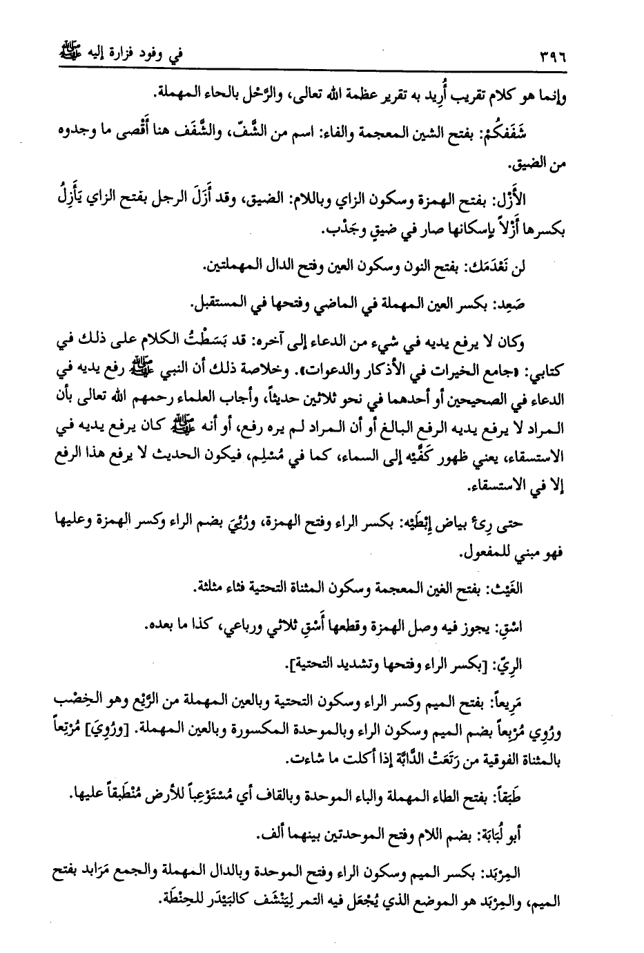 وكان لا يرفع يديه في شيء من الدعاء إلى آخره: قد بسطت الكلام على ذلك في كتابي: «جامع الخيرات في الأذكار والدعوات» . وخلاصة ذلك أن النبي صلى الله عليه وسلم رفع يديه في الدعاء في الصحيحين أو أحدهما في نحو ثلاثين حديثا، وأجاب العلماء رحمهم الله تعالى بأن المراد لا يرفع يديه الرفع البالغ أو أن المراد لم يره رفع، أو أنه صلى الله عليه وسلم كان يرفع يديه في الاستسقاء، يعني ظهور كفيه إلى السماء، كما في مسلم، فيكون الحديث لا يرفع هذا الرفع إلا في الاستسقاء.