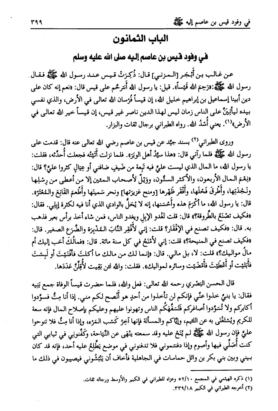 وروى الطبراني [ (2) ] بسند جيّد عن قيس بن عاصم رضي الله تعالى عنه قال: قدمت على رسول الله صلى الله عليه وسلم فلما رآني قال: «هذا سيّد أهل الوبر» . فلما نزلت أتيته فجعلت أحدّثه، فقلت: