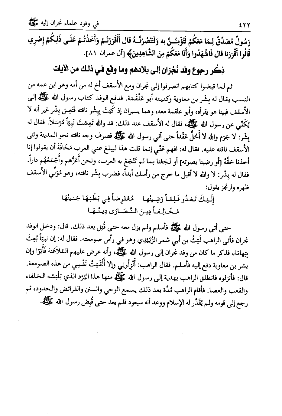 ثم لما قبضوا كتابهم انصرفوا إلى نجران ومع الأسقف أخ له من أمه وهو ابن عمه من النسب يقال له بشر بن معاوية وكنيته أبو علقمة. فدفع الوفد كتاب رسول الله صلى الله عليه وسلم إلى الأسقف فبينا هو يقرأه، وأبو علقمة معه، وهما يسيران إذ كبت ببشر ناقته فتعس بشر غير أنه لا يكنّي عن رسول الله صلى الله عليه وسلم، فقال له الأسقف عند ذلك: قد والله تعست نبيا مرسلا. فقال له بشر: لا جرم والله لا أحلّ عقدا حتى أتى رسول الله صلى الله عليه وسلم فصرف وجه ناقته نحو المدينة وثنى الأسقف ناقته عليه. فقال له: افهم عنّي إنما قلت هذا ليبلغ عني العرب مخافة أن يقولوا إنا أخذنا حقّه [أو رضينا بصورته] أو نجعنا بما لم تنجع به العرب، ونحن أعزّهم وأجمعهم دارا.