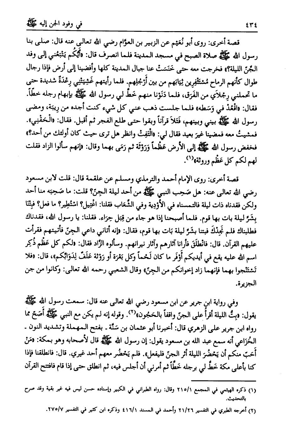 فقلنا: يا رسول الله، فقدناك فطلبناك فلم نجدك فبتنا بشرّ ليلة بات بها قوم، فقال: «إنه أتاني داعي الجنّ فأتيتهم فقرأت عليهم القرآن. قال: فانطلق فأرانا آثارهم وآثار نيرانهم. وسألوه الزّاد فقال: «لكم كل عظم ذكر اسم الله عليه يقع في أيديكم أوفر ما كان لحما وكل بعرة أو روثة علف لدوابّكم» ، قال: «فلا تستنجوا بهما فإنهما زاد إخوانكم من الجنّ»