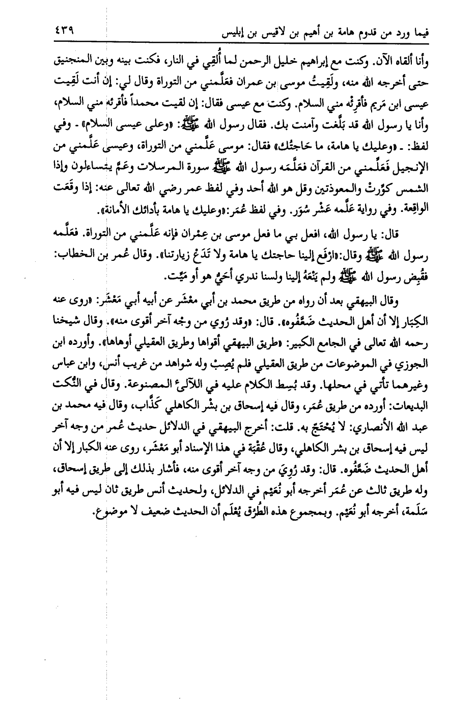 قال: يا رسول اللَّه، افعل بي ما فعل موسى بن عمران فإنه علّمني من التوراة. فعلّمه رسول اللَّه صلى اللَّه عليه وسلم وقال: «ارفع إلينا حاجتك يا هامة ولا تدع زيارتنا» . وقال عمر بن الخطاب: